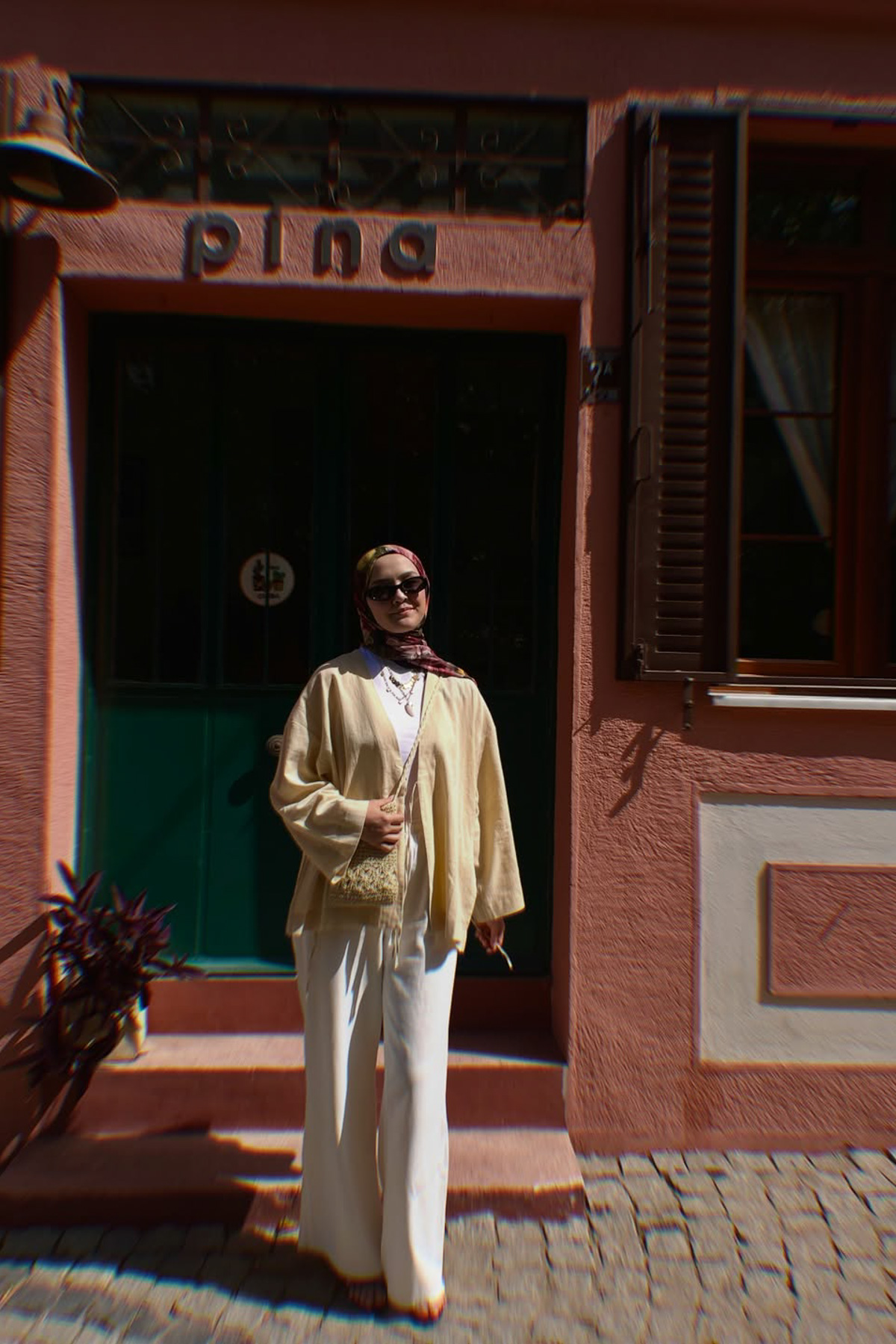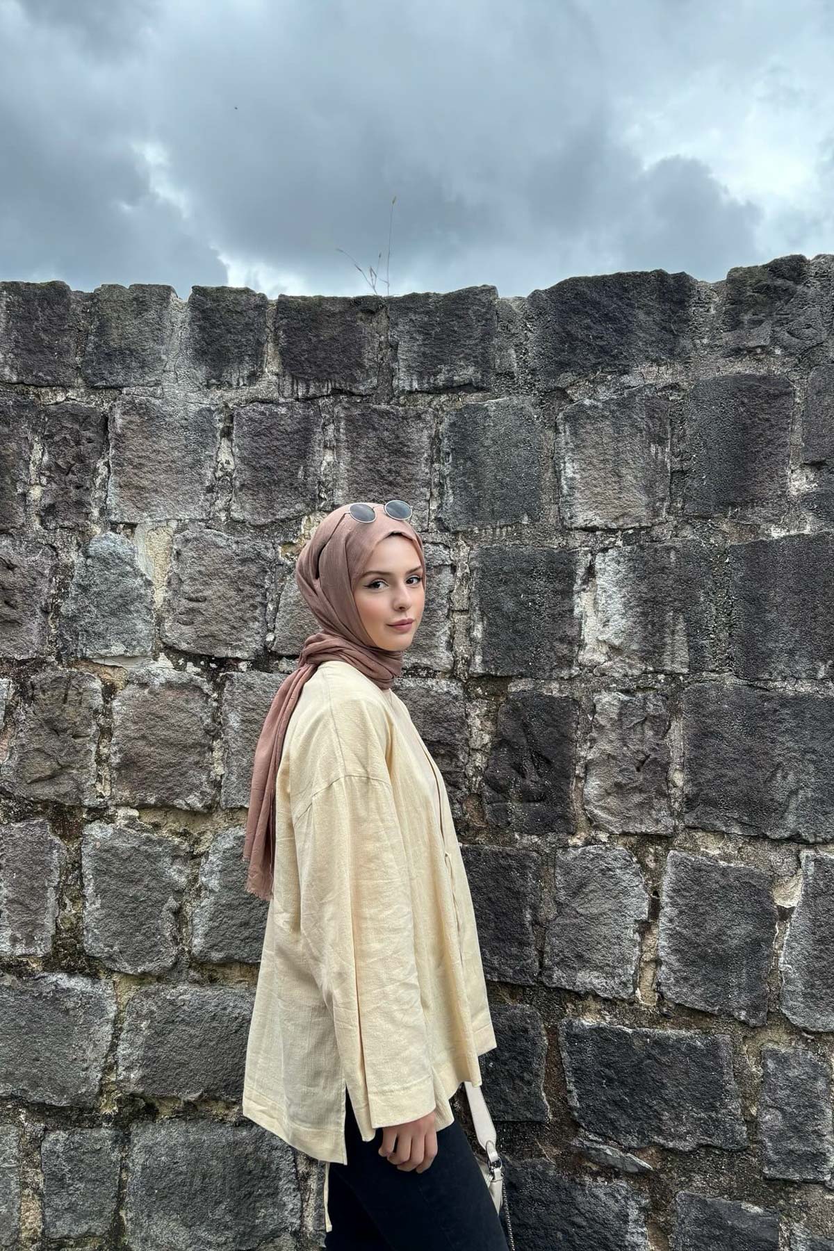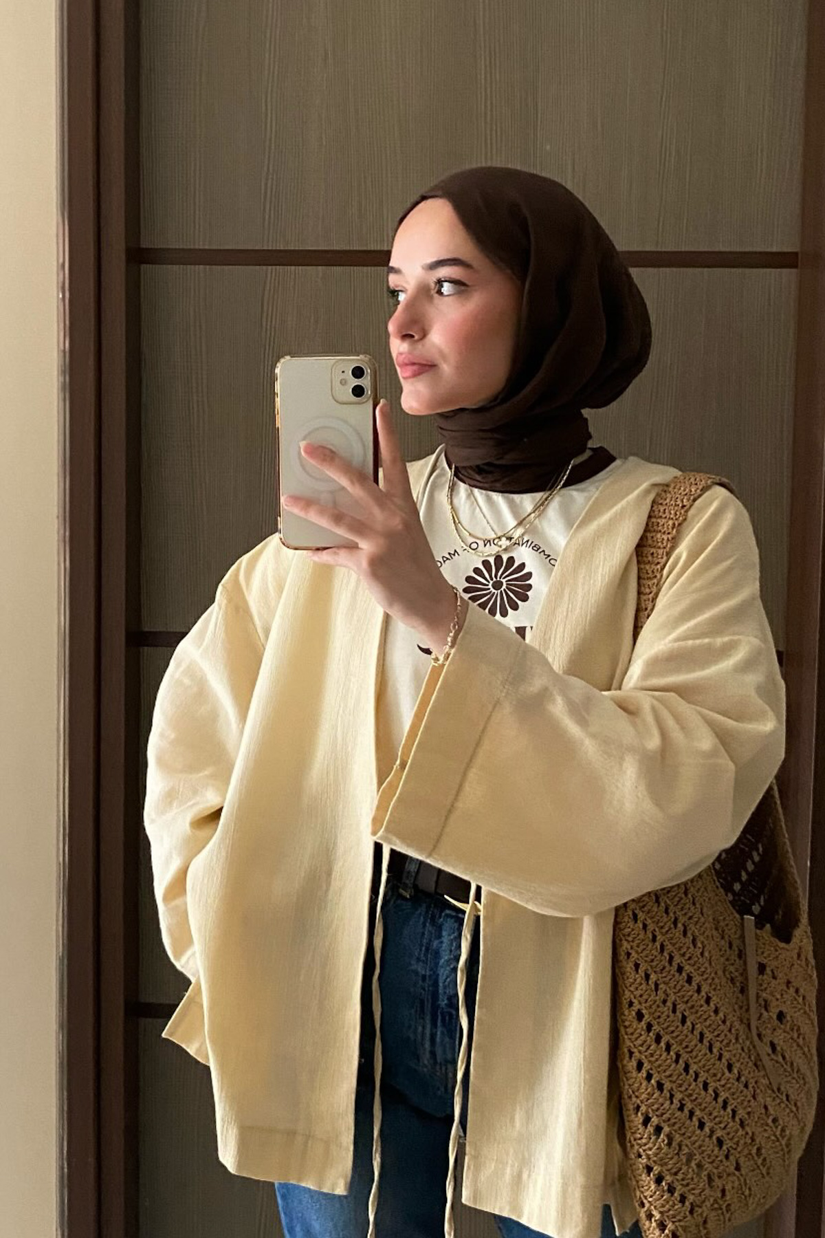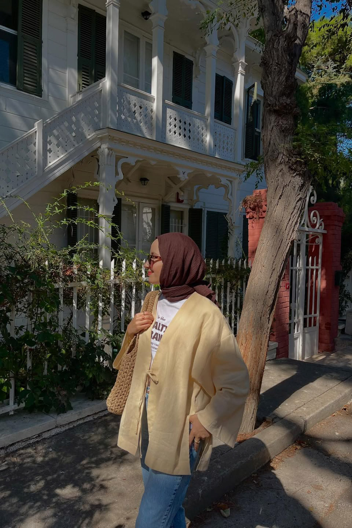 Pamuklu krinkıl kumaştan, önü iki farklı şekilde kapanabilen, bağcıklı kimono.