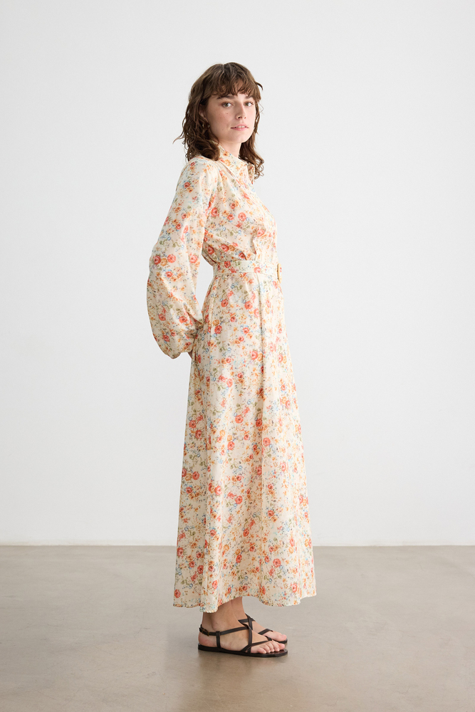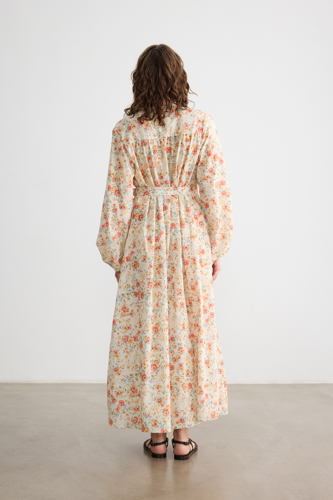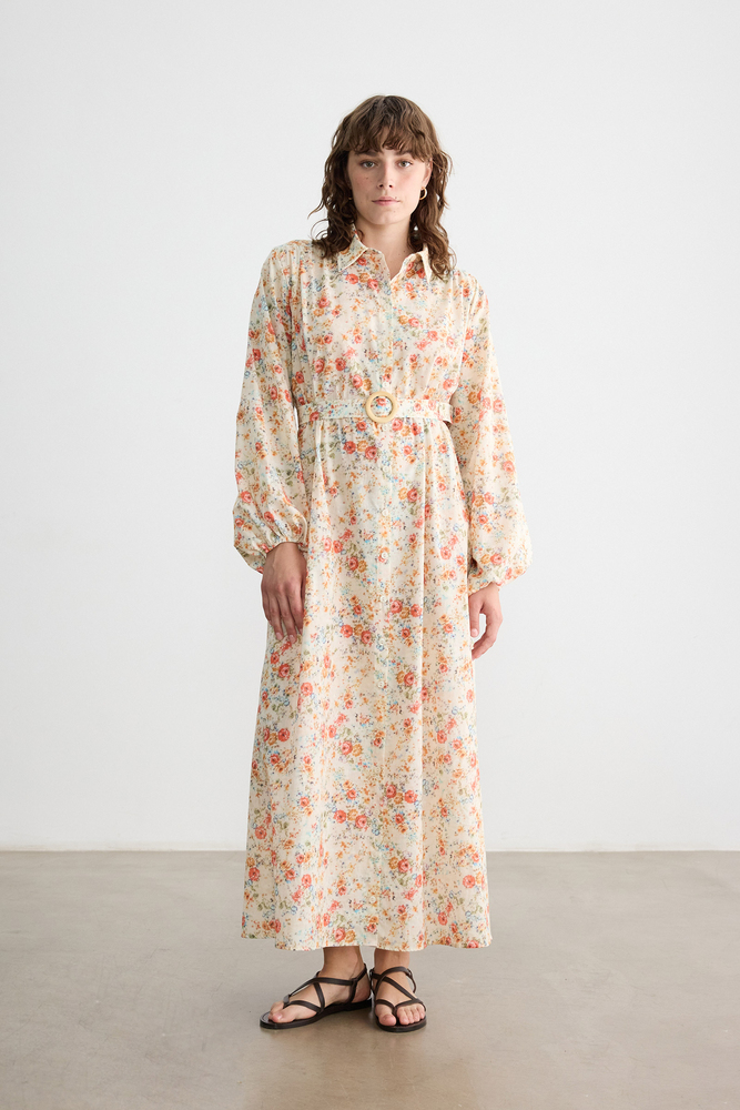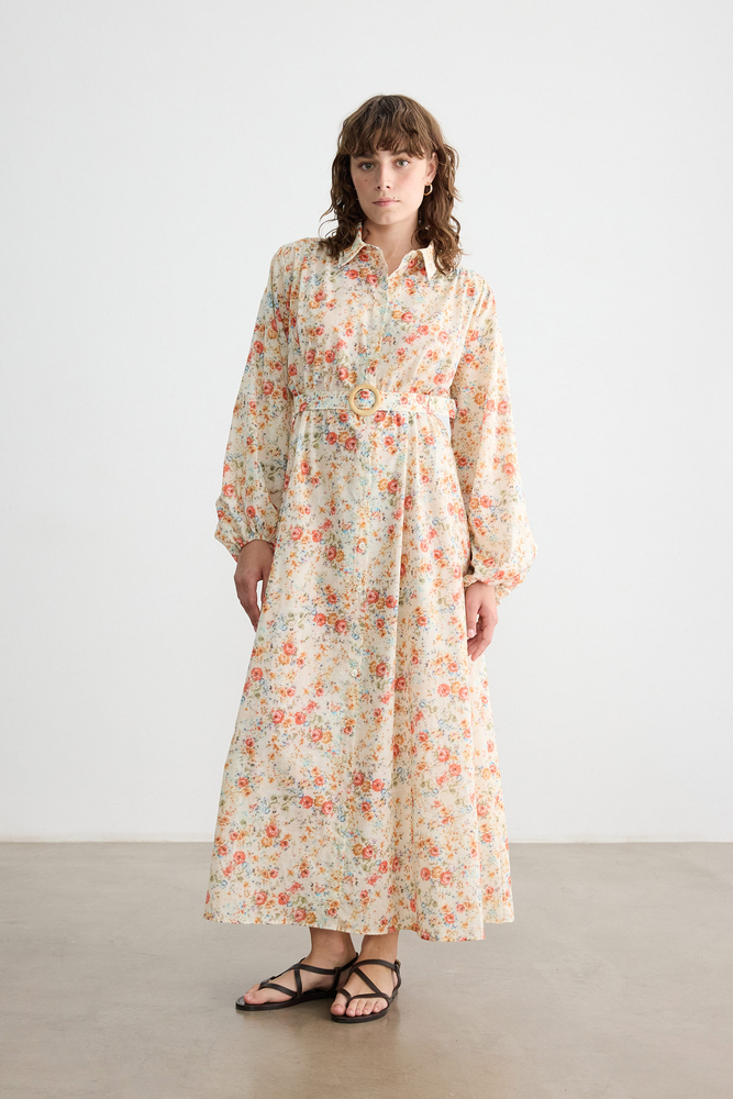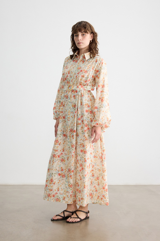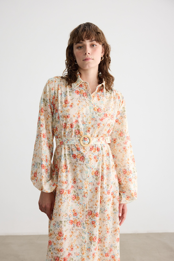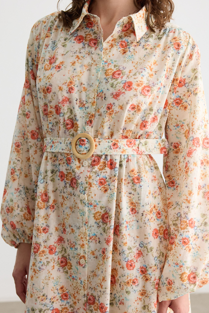 Önü düğmeli, kendi kumaşından kemerli, kemeri ahşap toka detaylı, balon kollu astarsız elbise.
