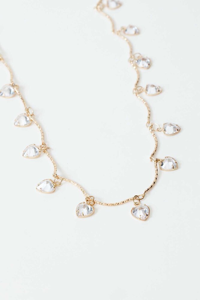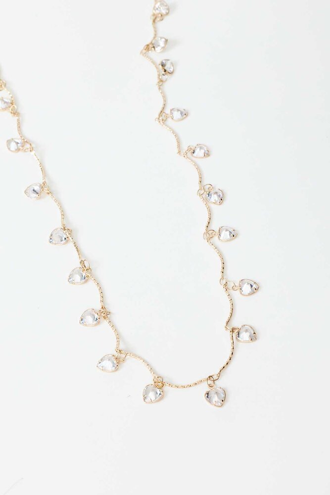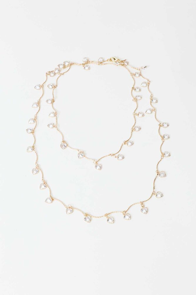 Kalp şeklinde küçük taşları olan, uzun kolye.