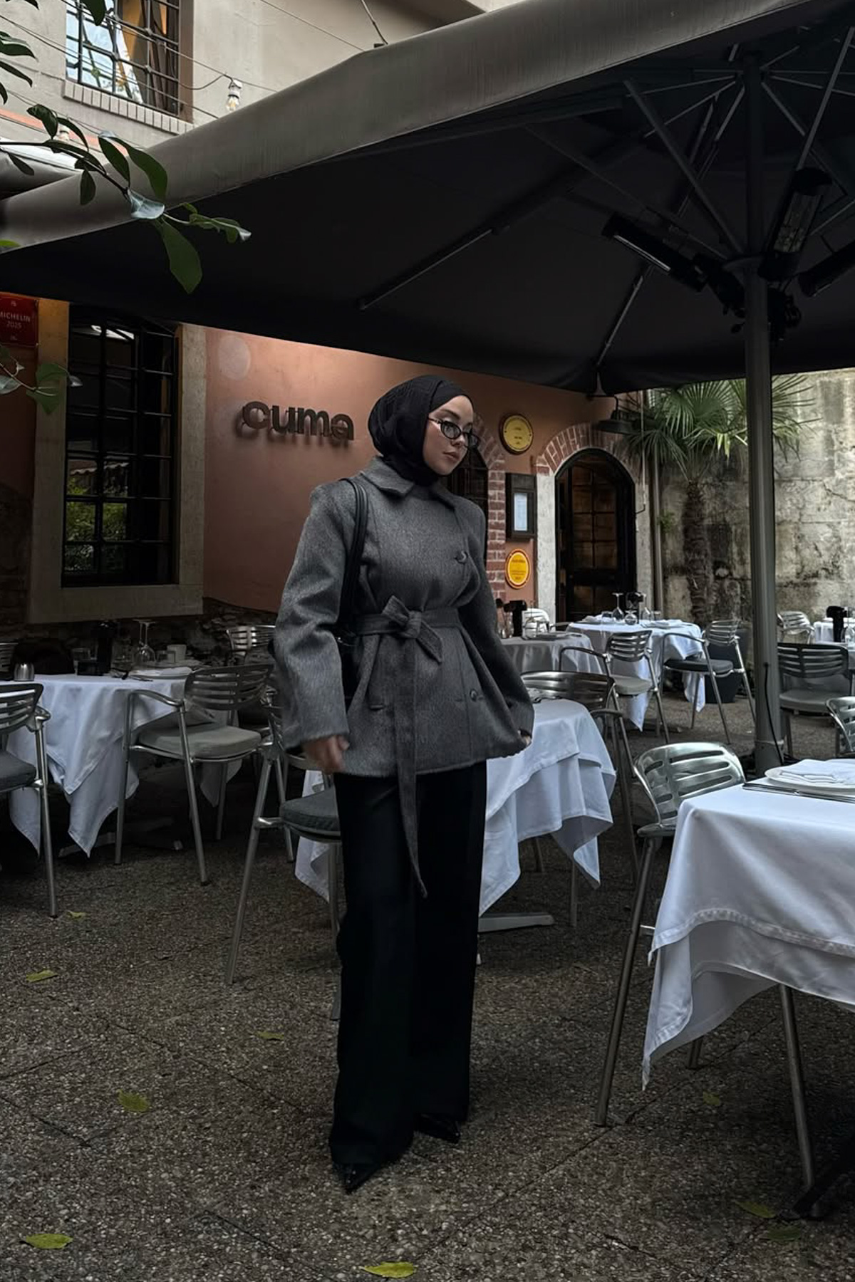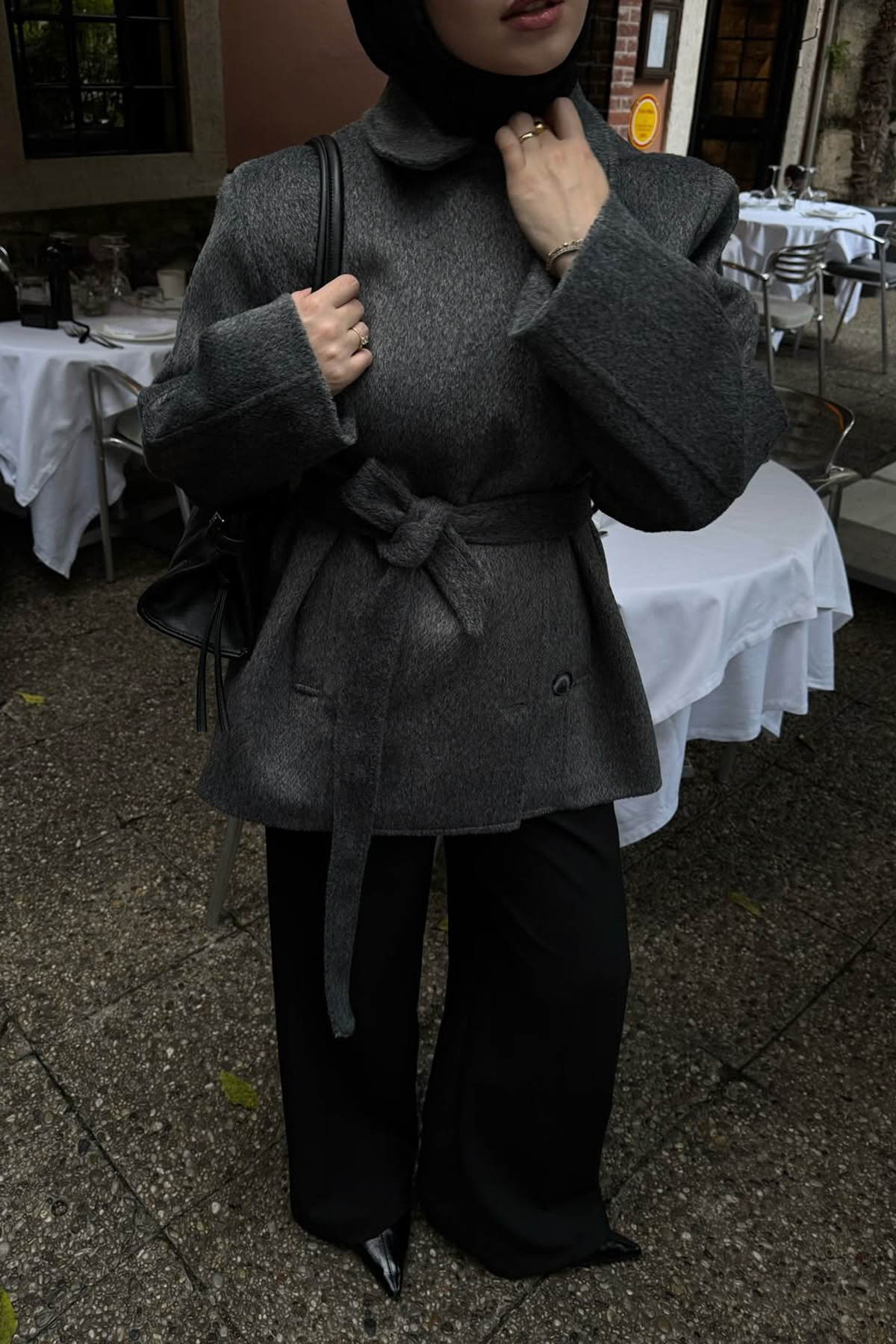 Kruvaze kapamalı, düğmeli, kuşaklı, cepli ve astarlı orta boy kaban.
