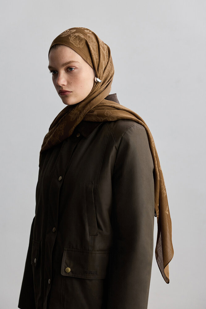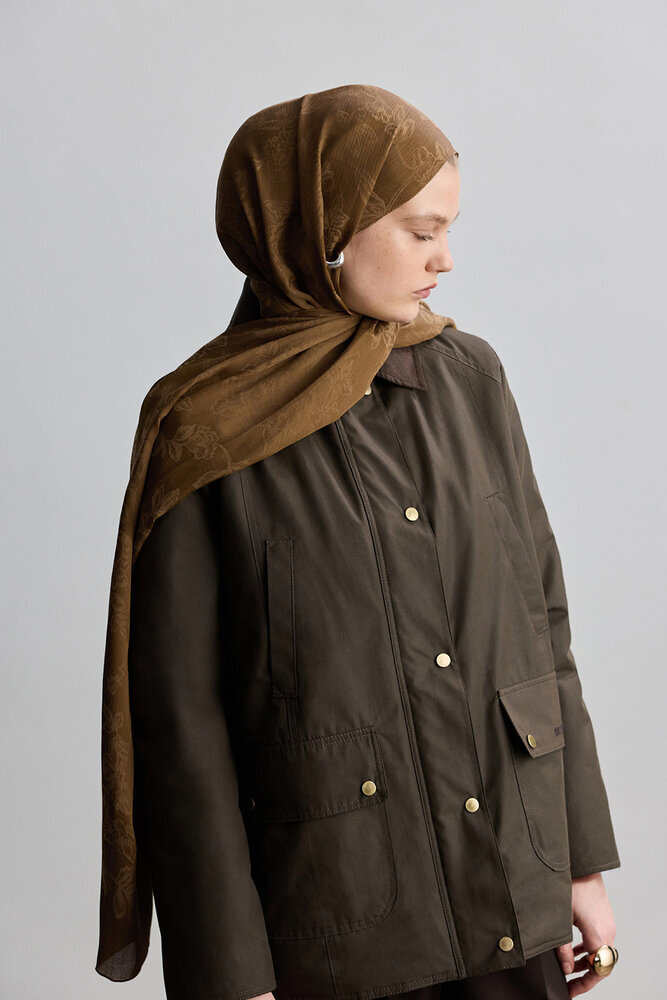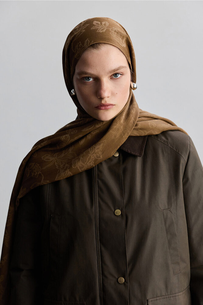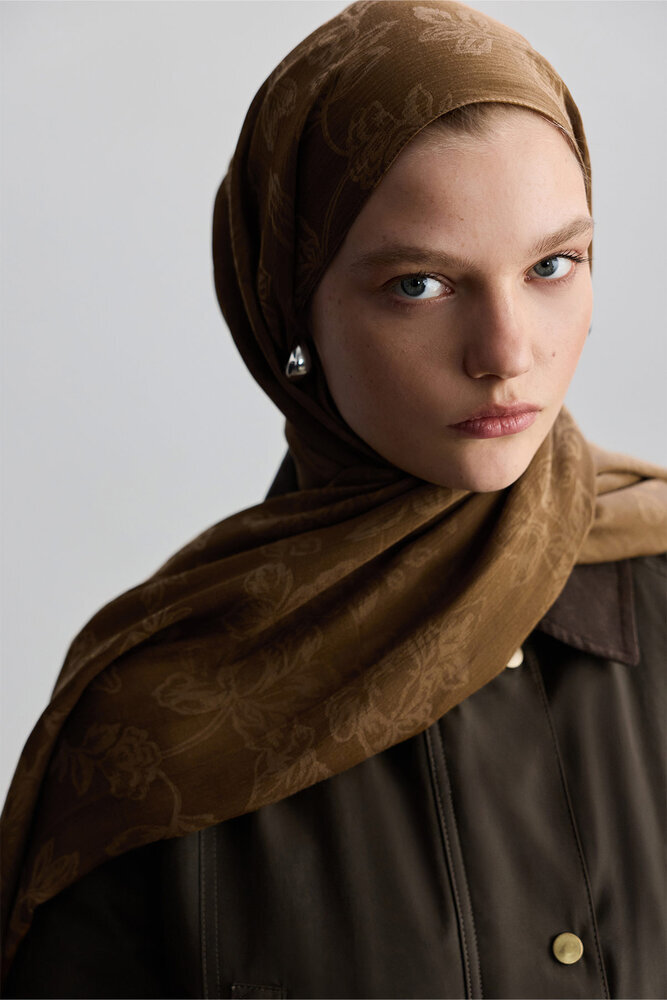 Jakarlı kumaştan kendinden desenli, yumuşak dokulu şal.