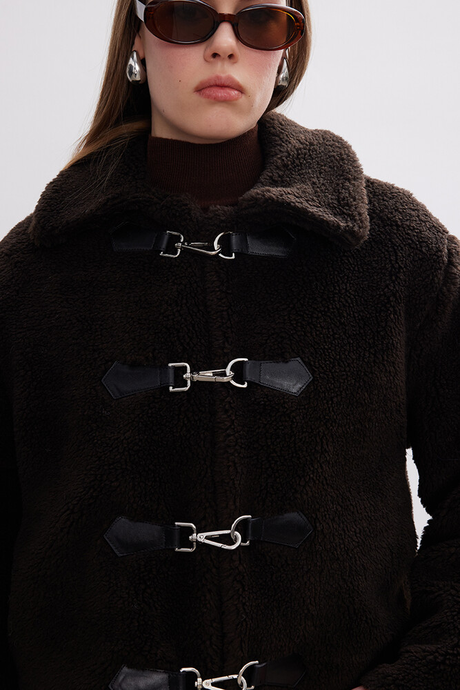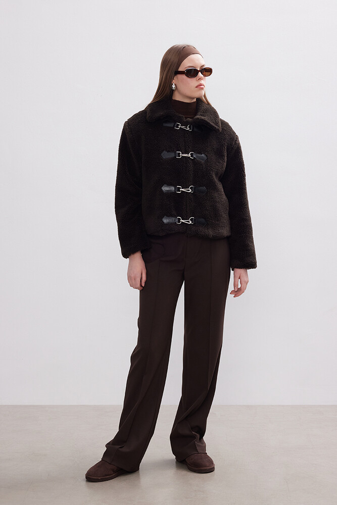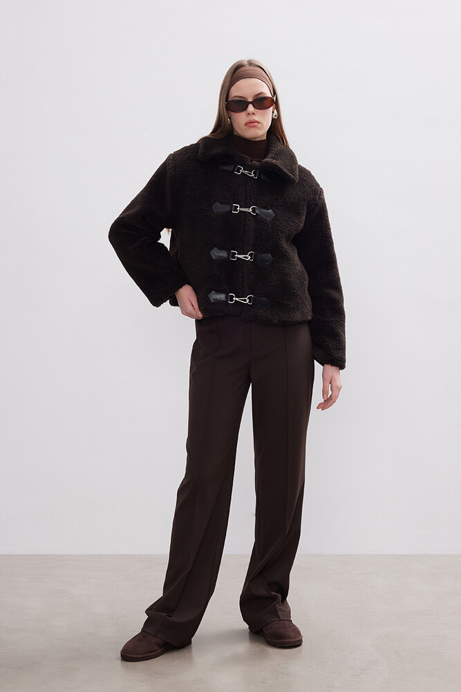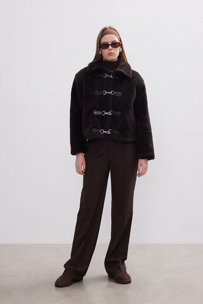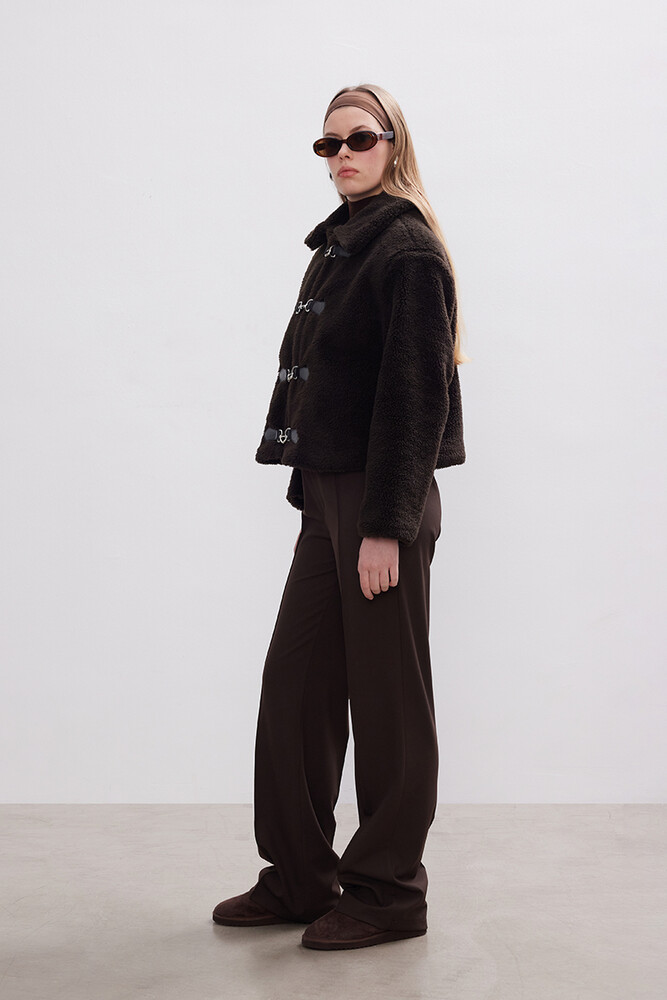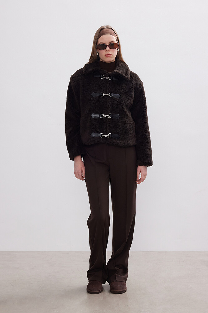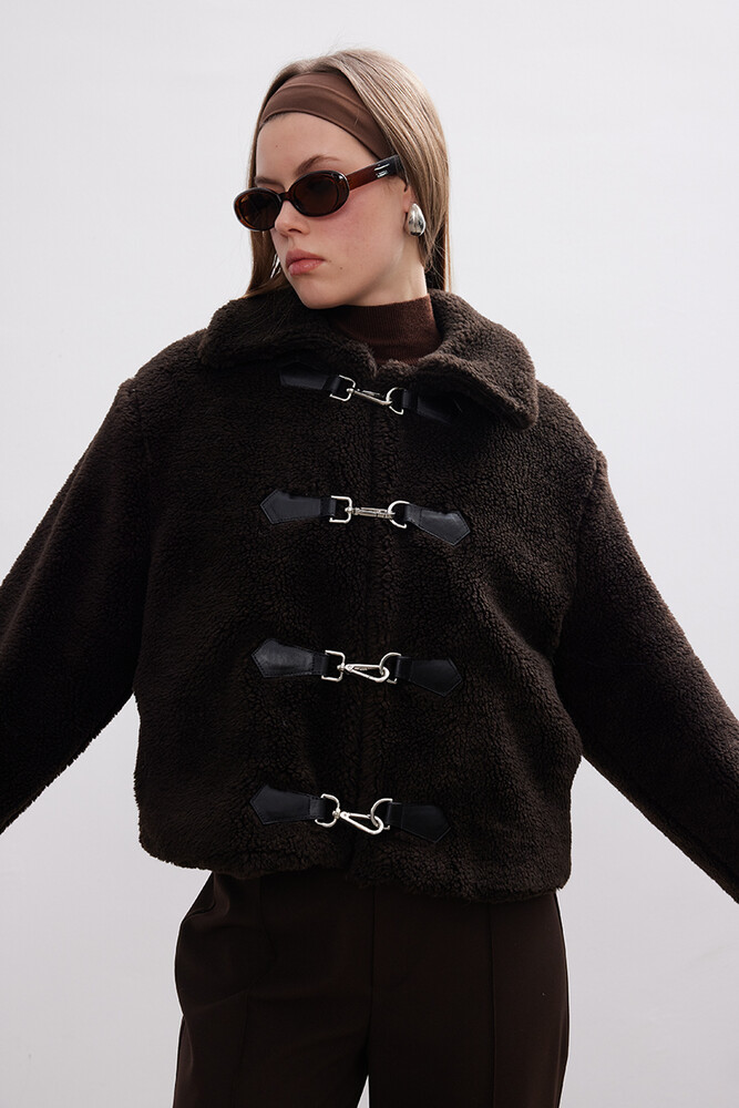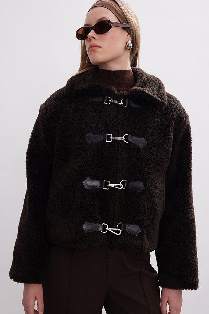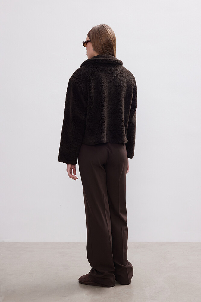 Yakalı , önde kanca kapamalı , astarlı crop peluş ceket