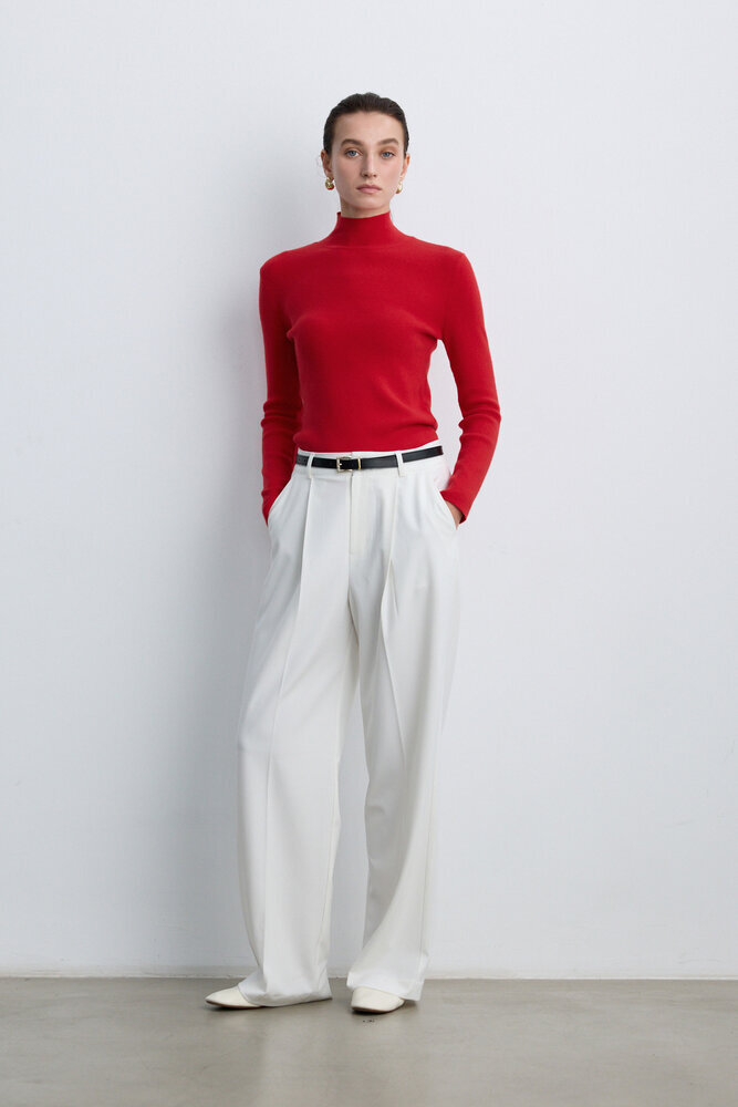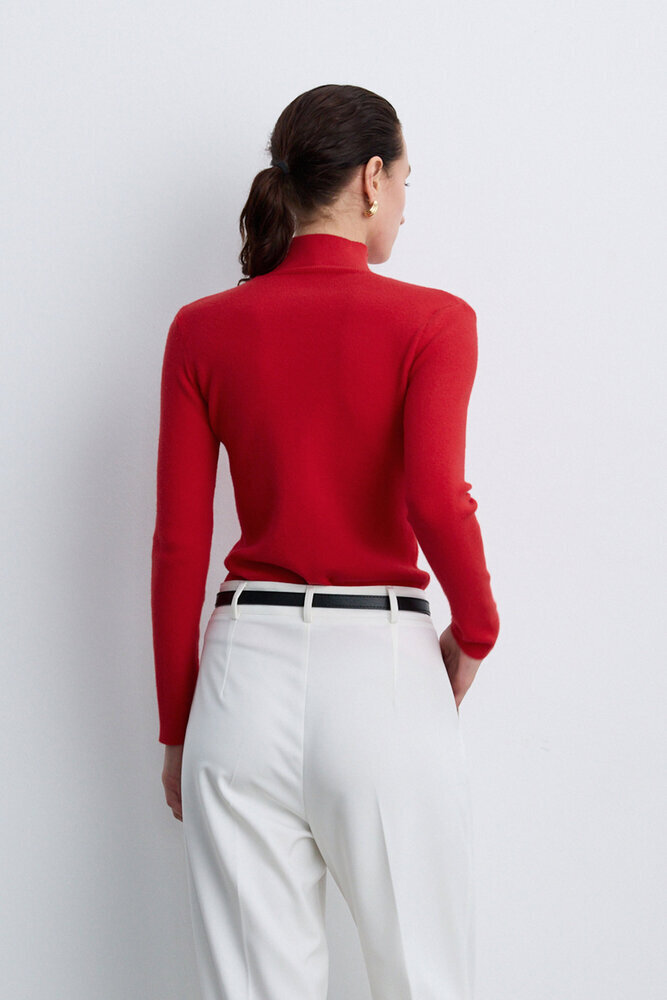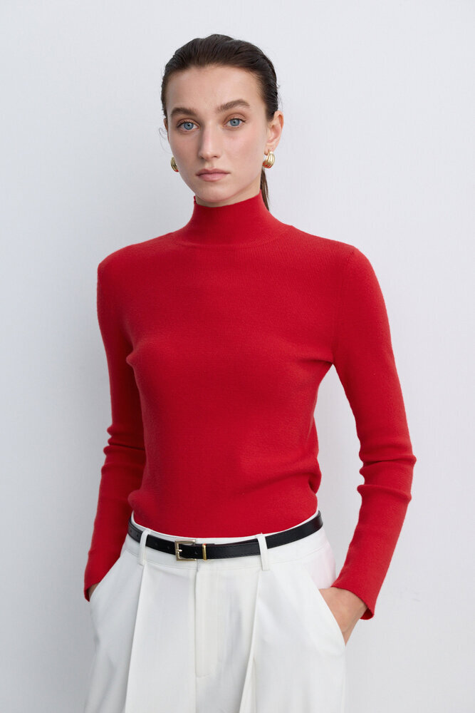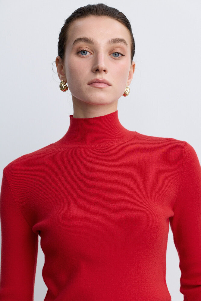 Viskon karışımlı iplikten, dik yakalı, uzun kollu, kısa triko kazak.