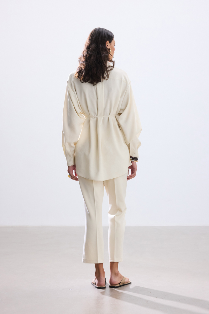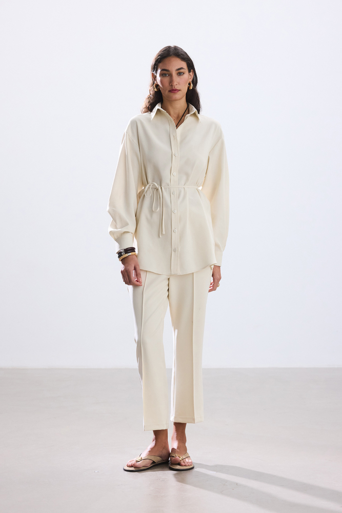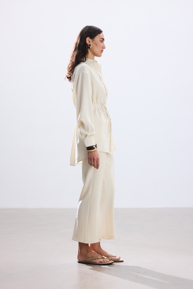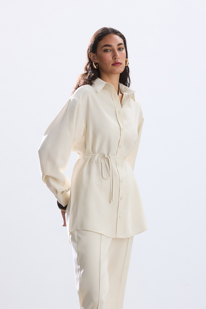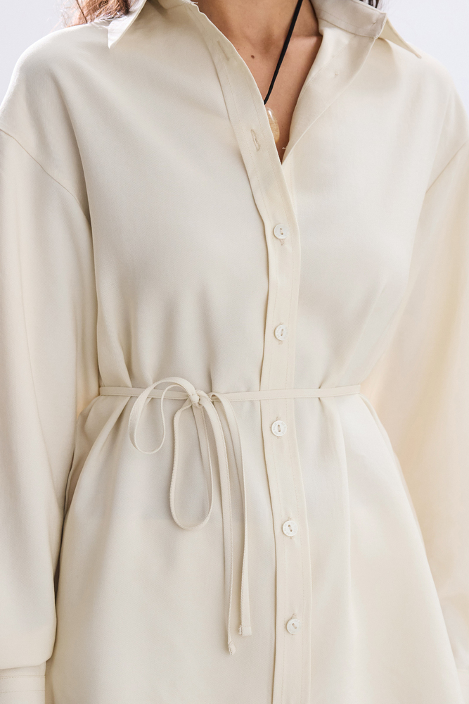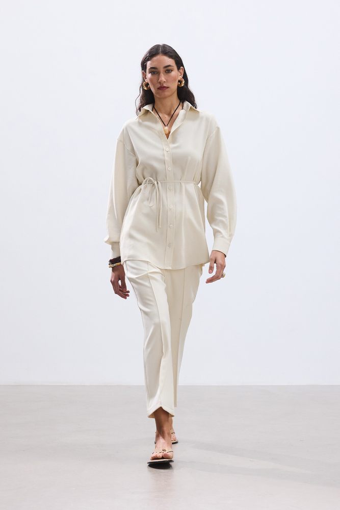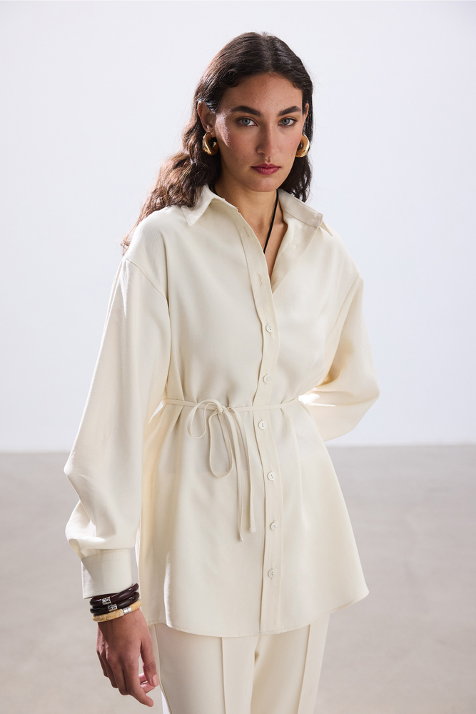 Modal kumaşlı, gömlek yakalı, geniş kol kesimli, ince kuşaklı gömlek.