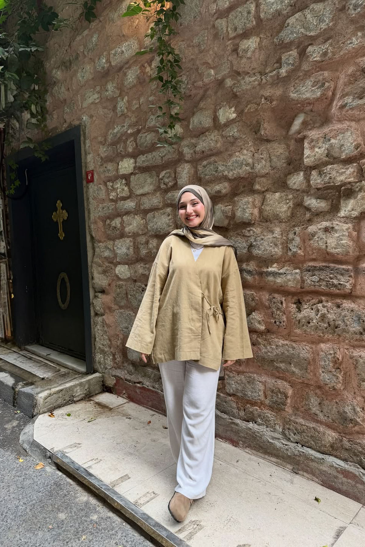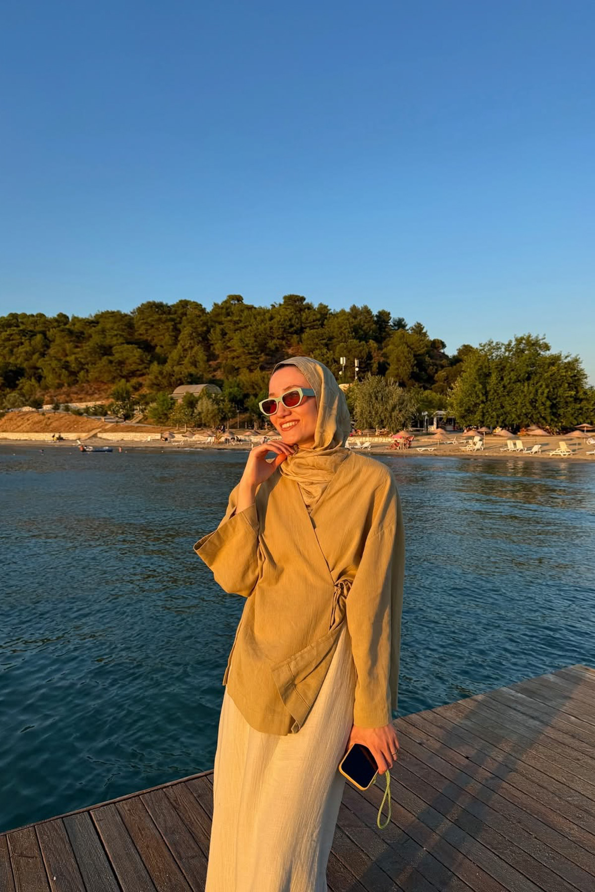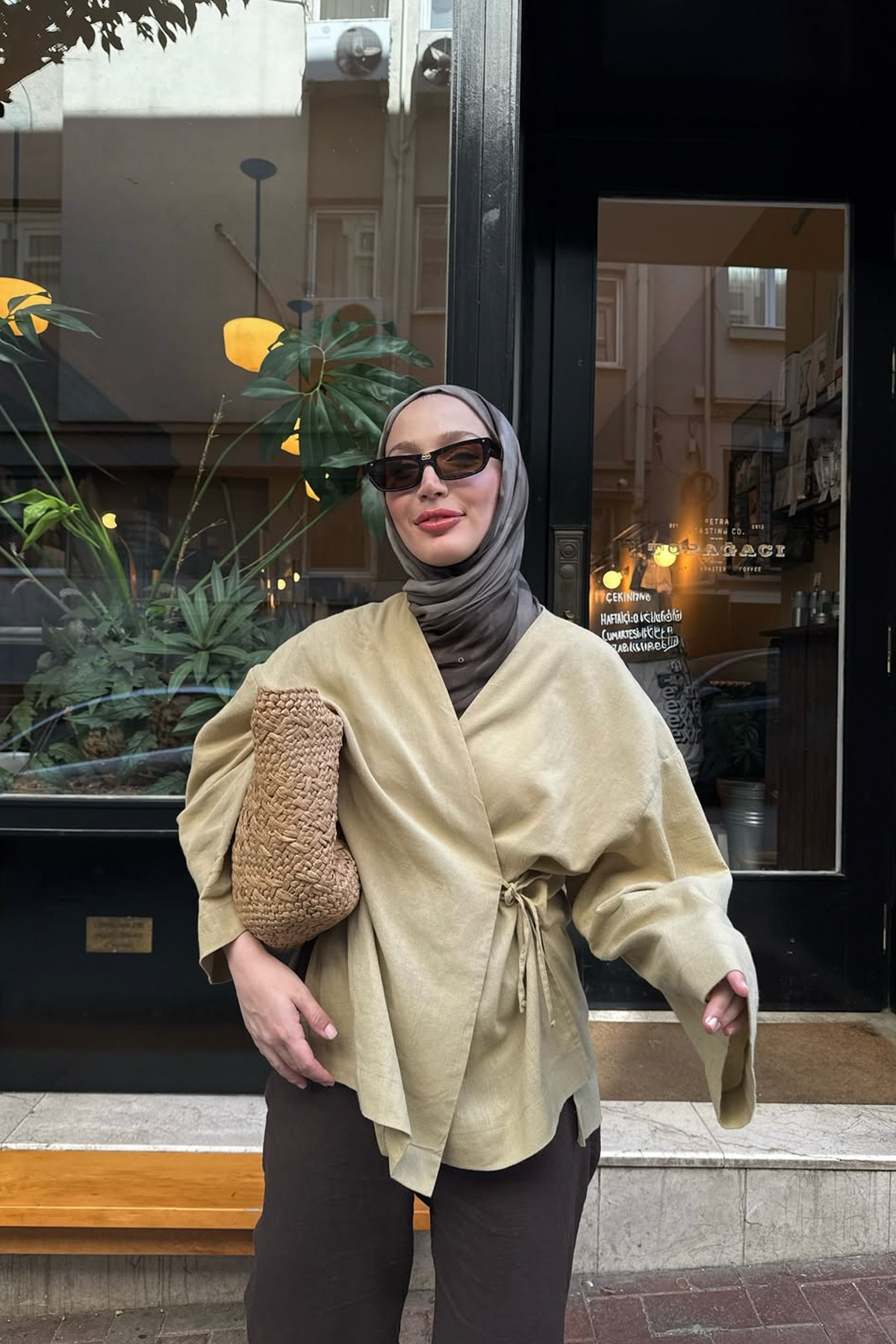 Pamuklu krinkıl kumaştan, önü iki farklı şekilde kapanabilen, bağcıklı kimono.