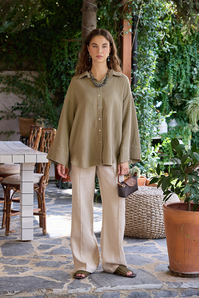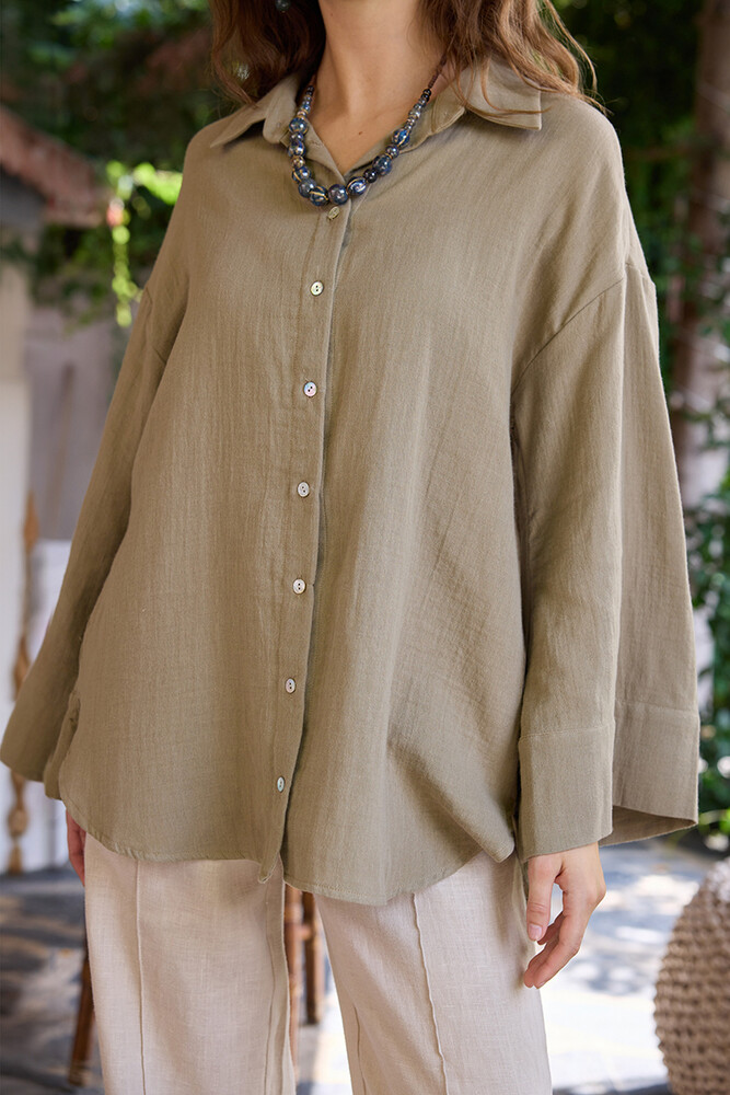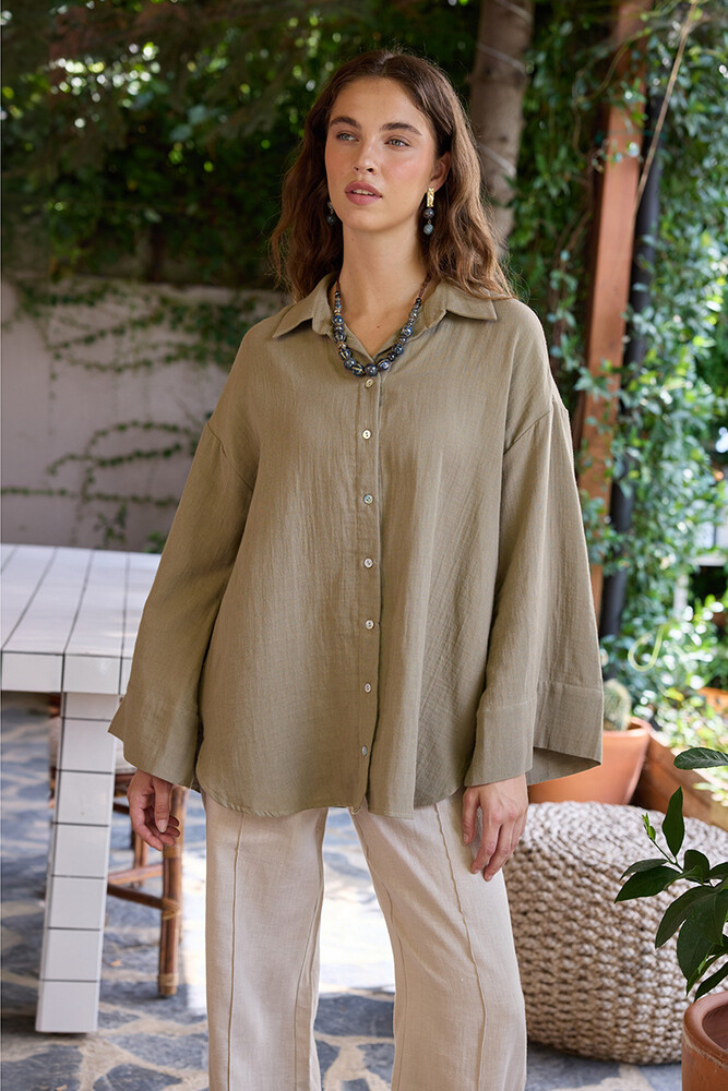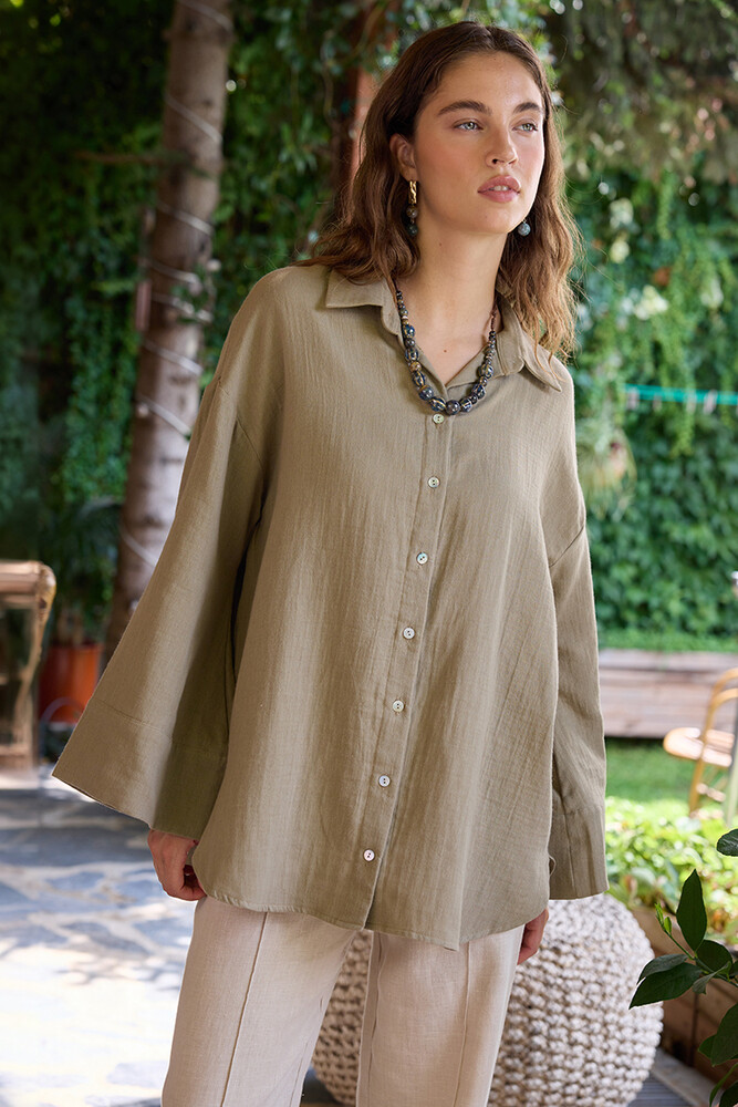 Muslin kumaştan, önü sedefli düğme detayı olan, kimono kollu gömlek.