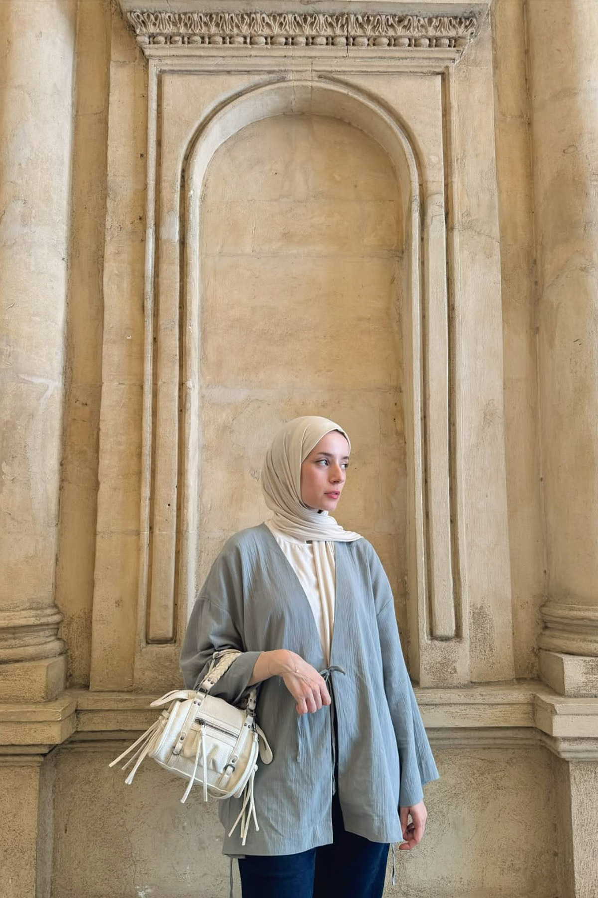 Pamuklu krinkıl kumaştan, önü iki farklı şekilde kapanabilen, bağcıklı kimono.