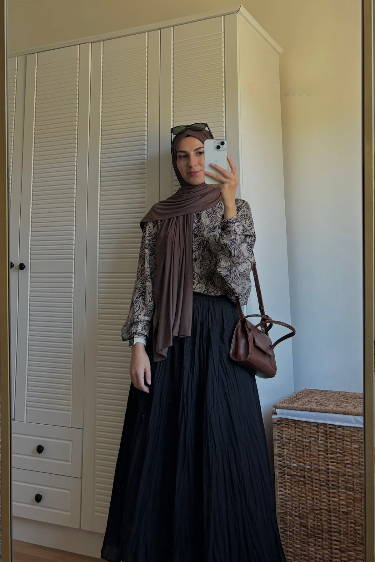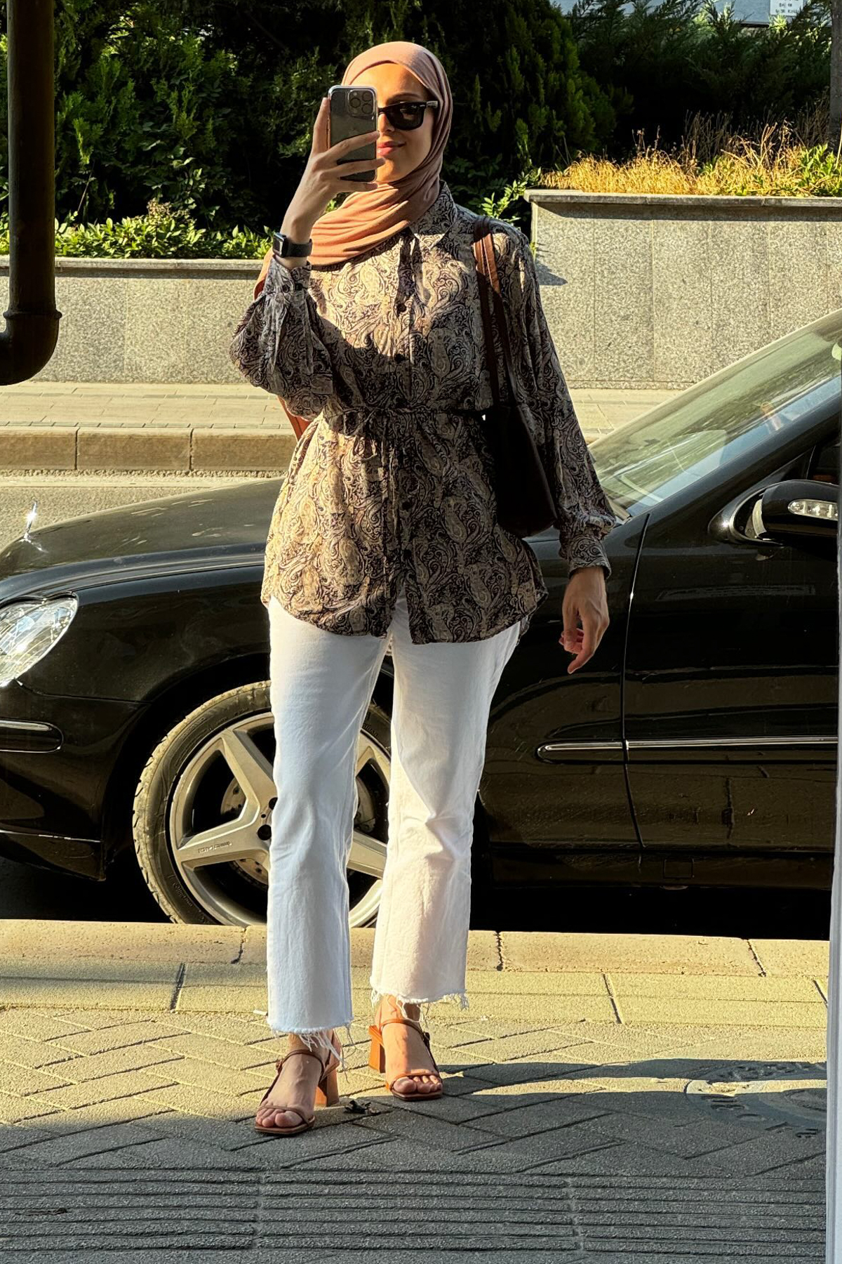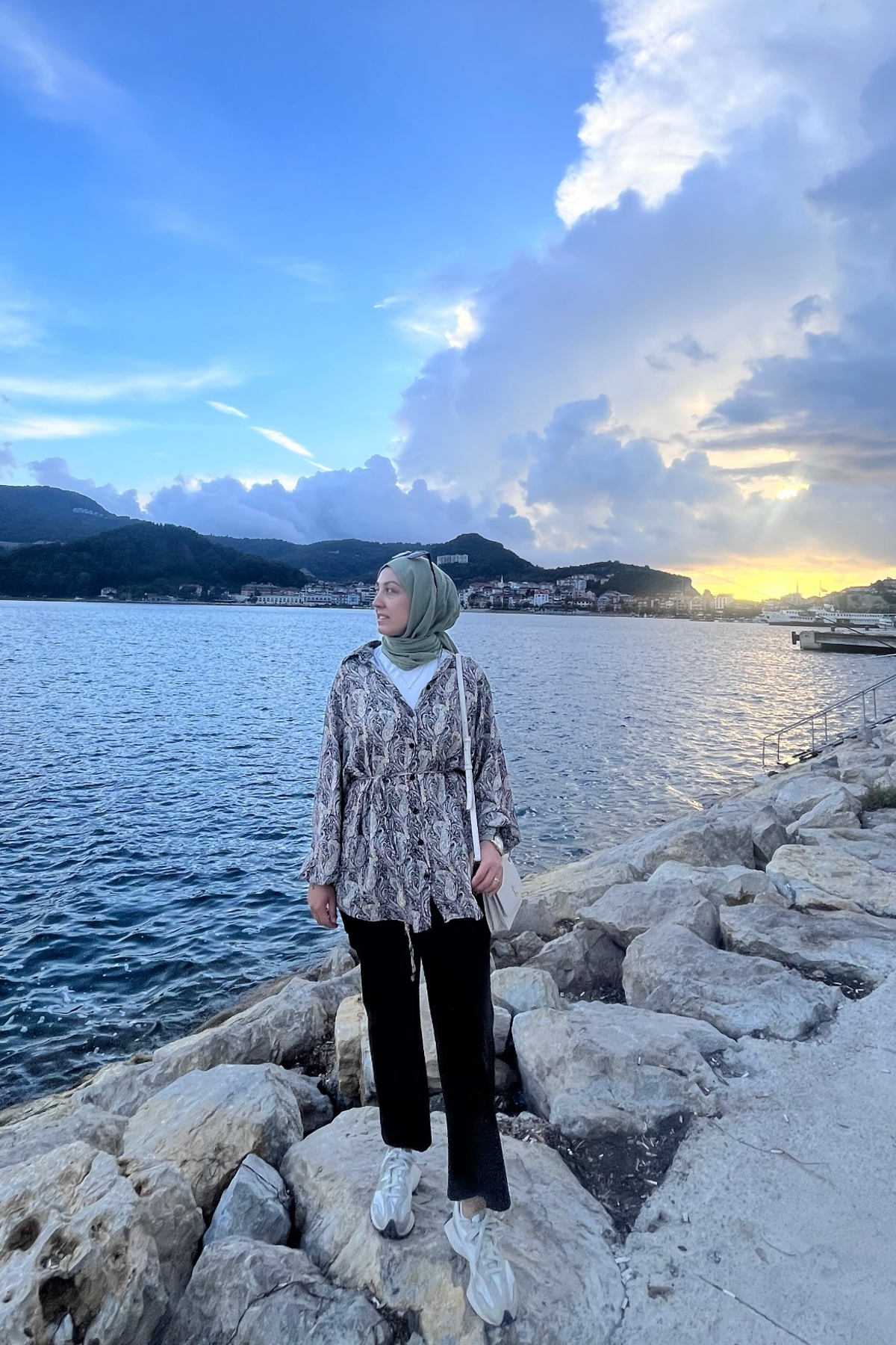 %100 viskon kumaşlı, gömlek yakalı, manşetli, geniş kol kesimli, ince kuşaklı gömlek.