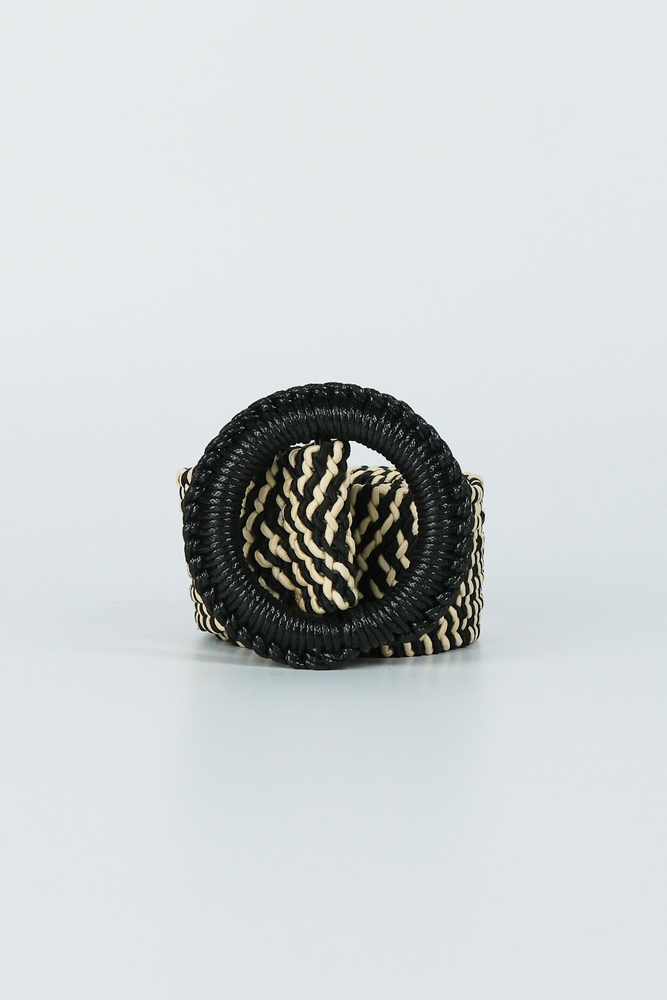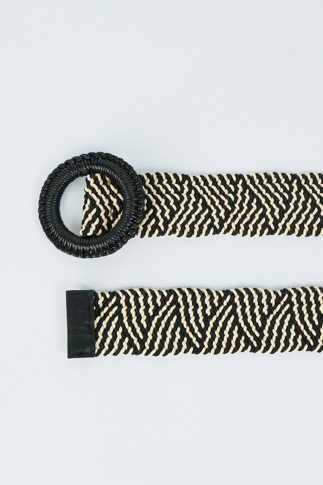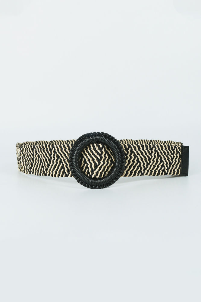 Yuvarlak toka detaylı, çift renk örgülü kemer.