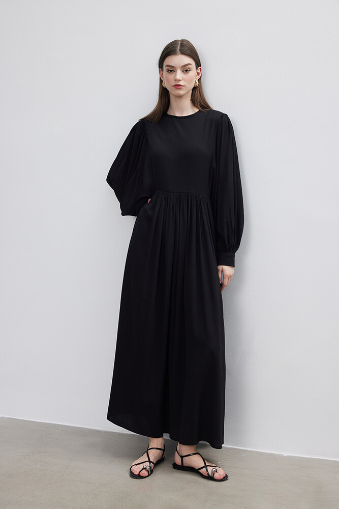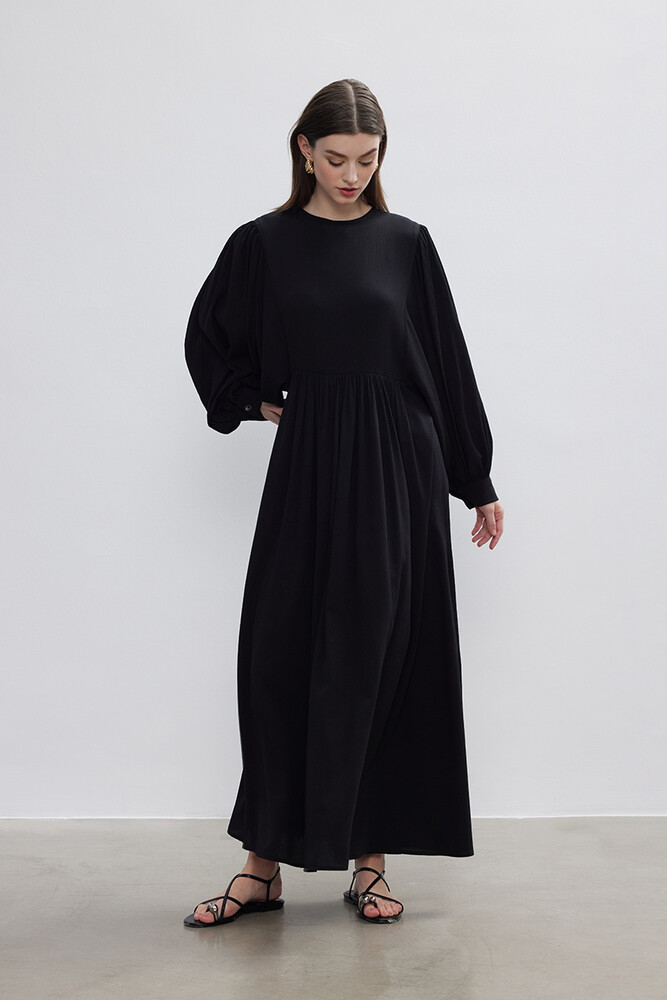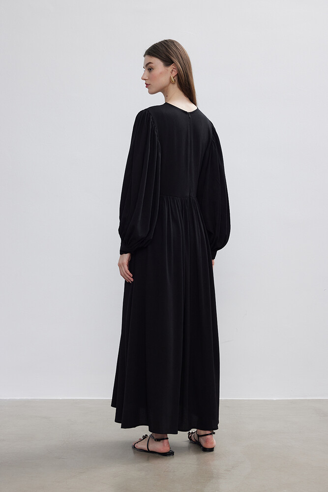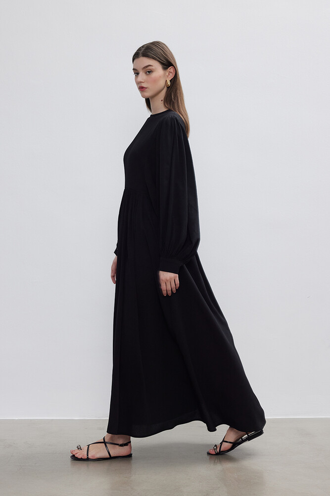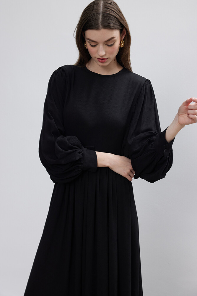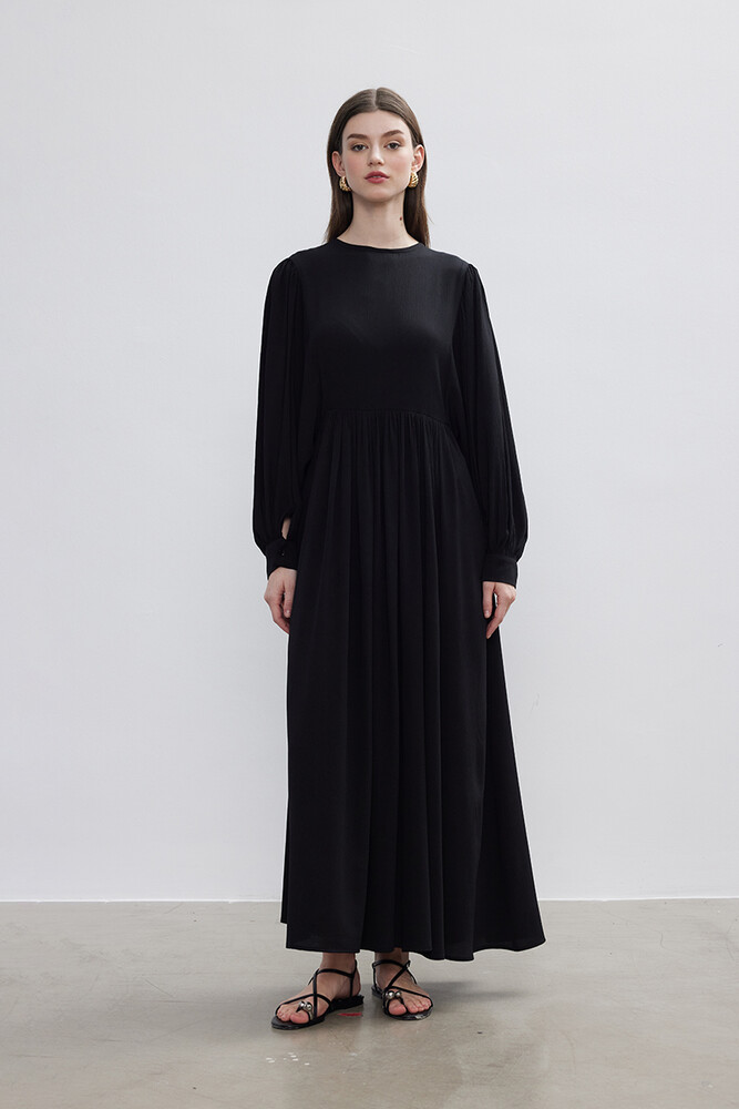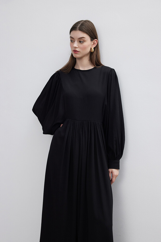 Geniş kollu, belde kesik detaylı, gizli fermuarlı, krınkıl kumaştan astarsız elbise.