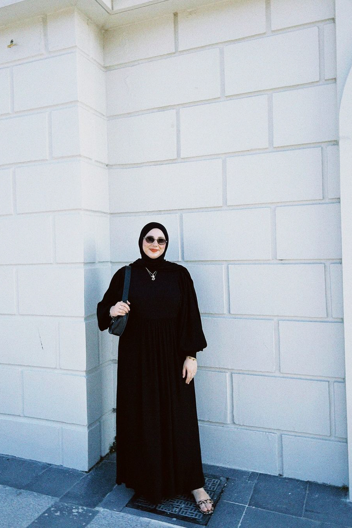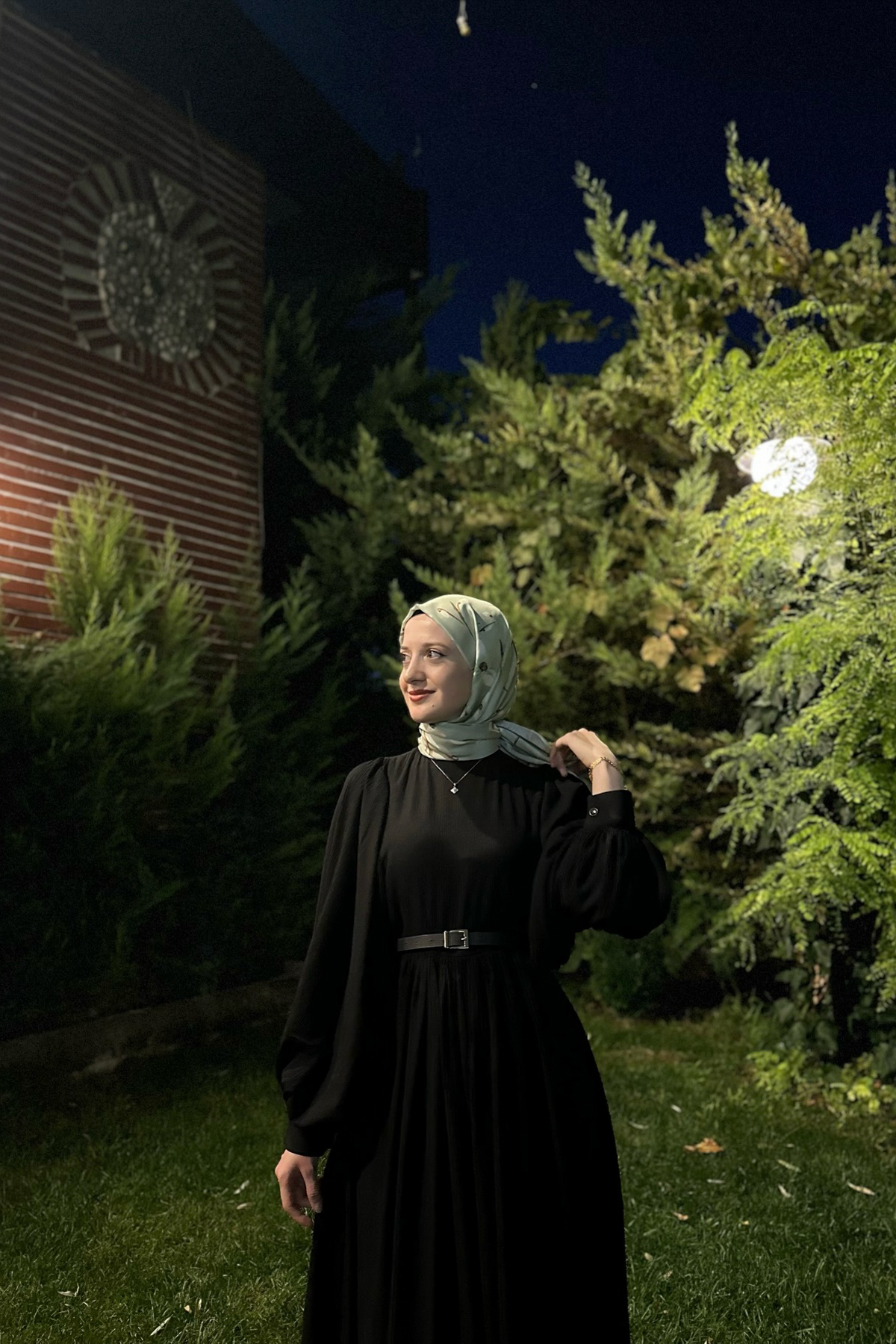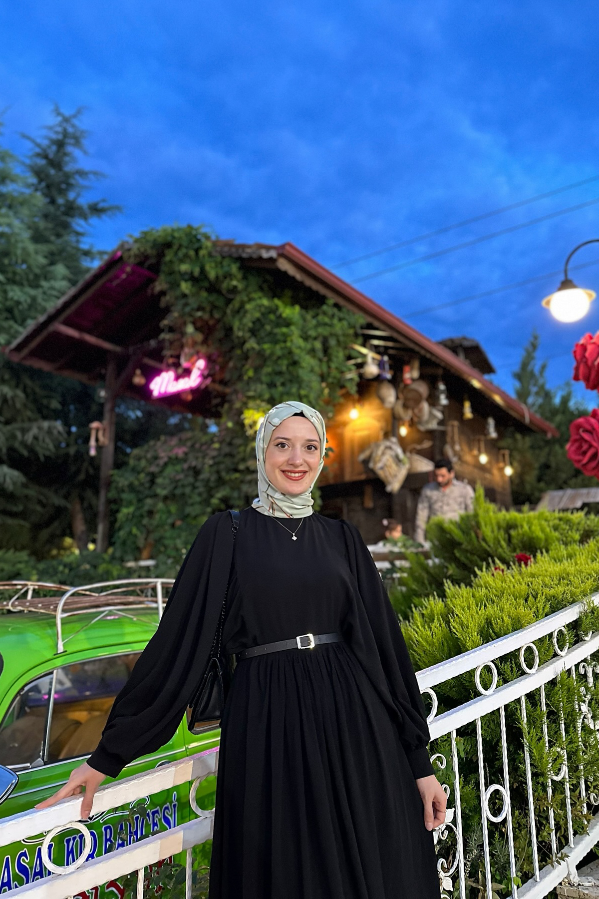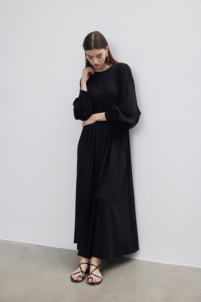 Geniş kollu, belde kesik detaylı, gizli fermuarlı, krınkıl kumaştan astarsız elbise.