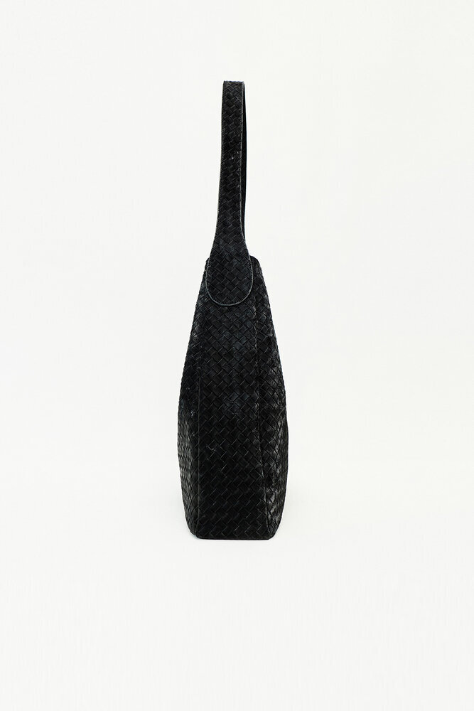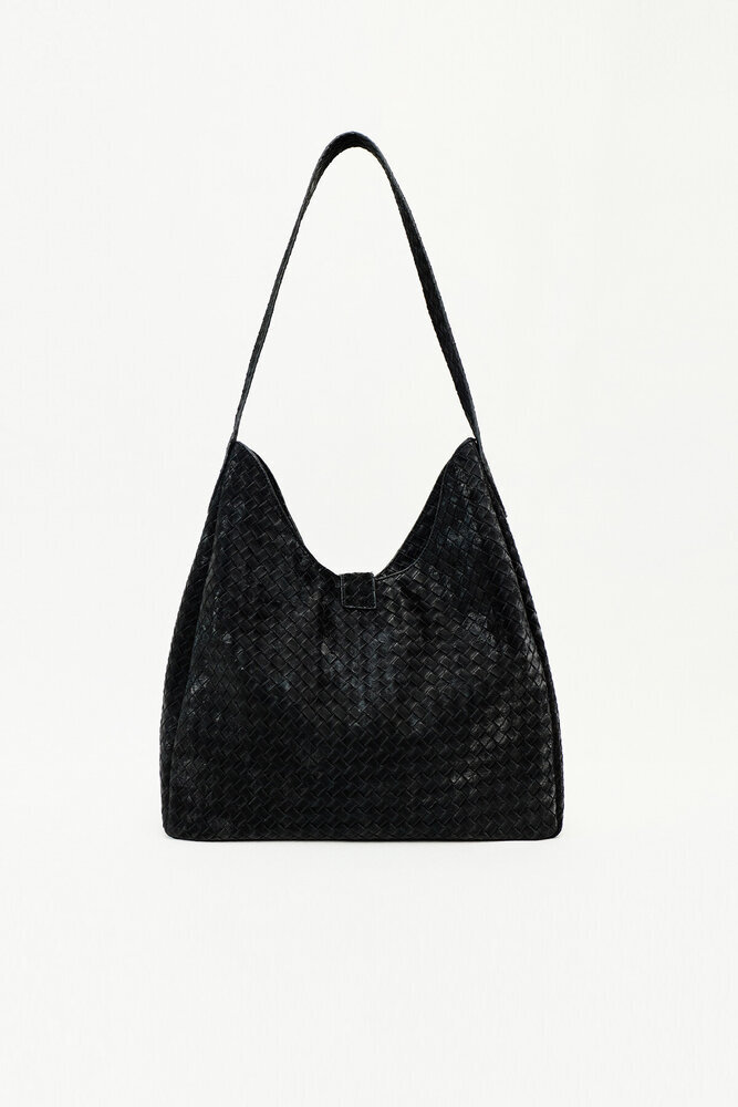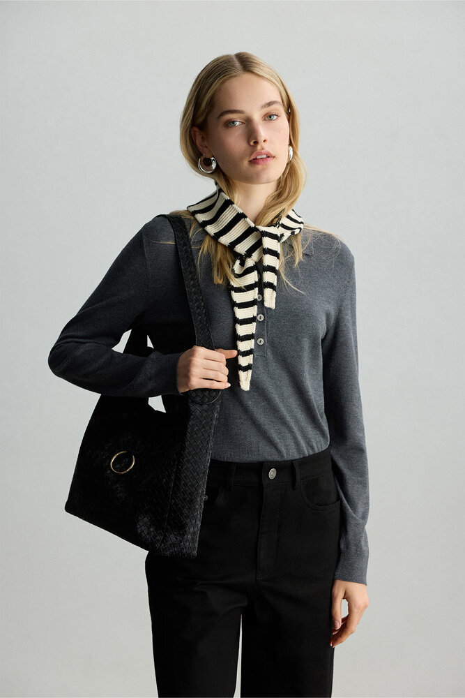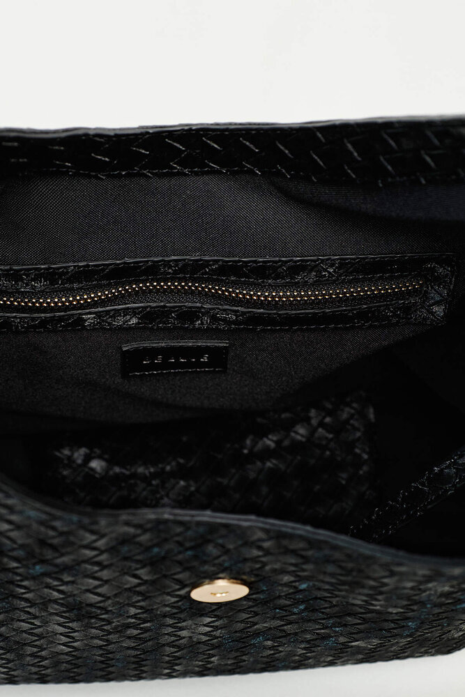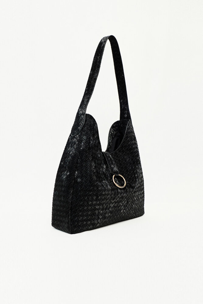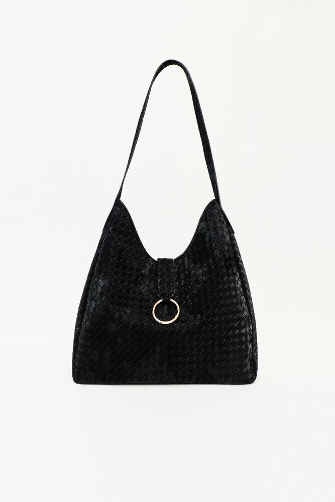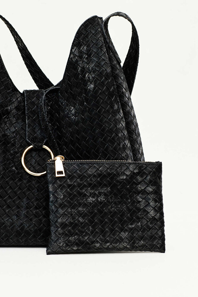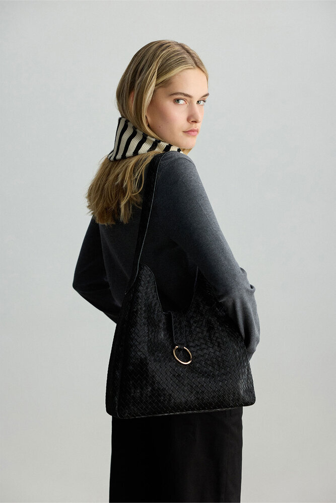Örgü görünümlü, fermuarlı iç gözü ve küçük cüzdan detayı bulunan omuz çantası.