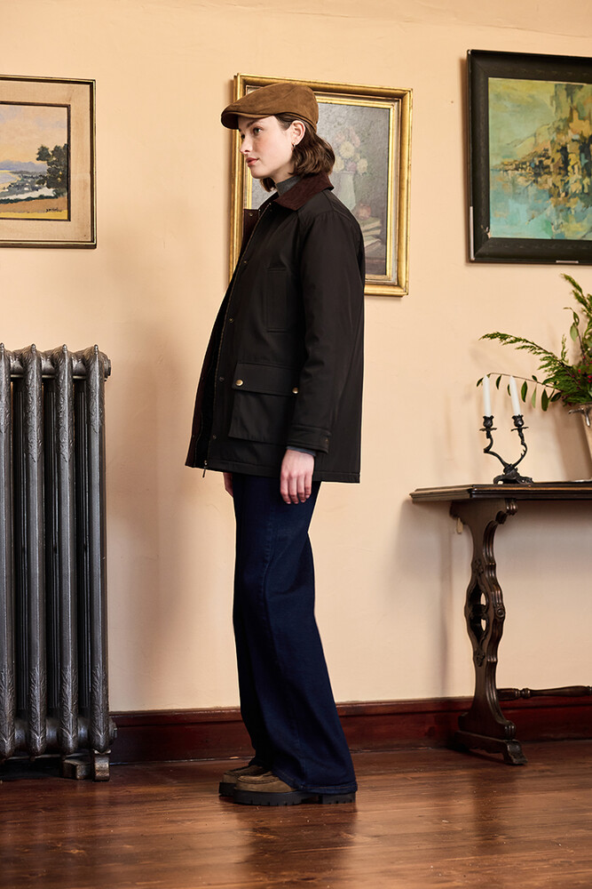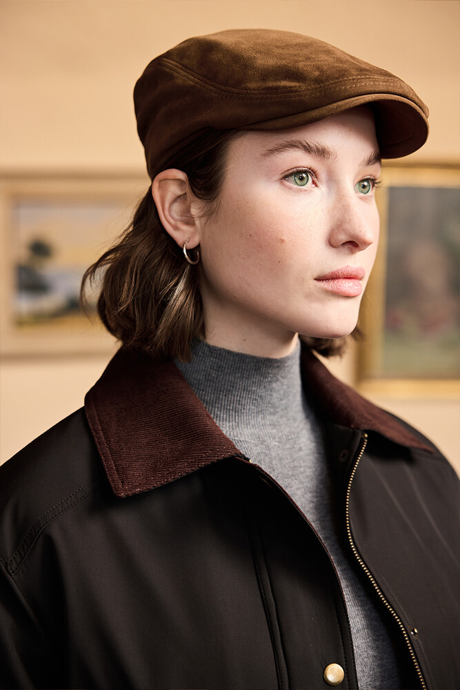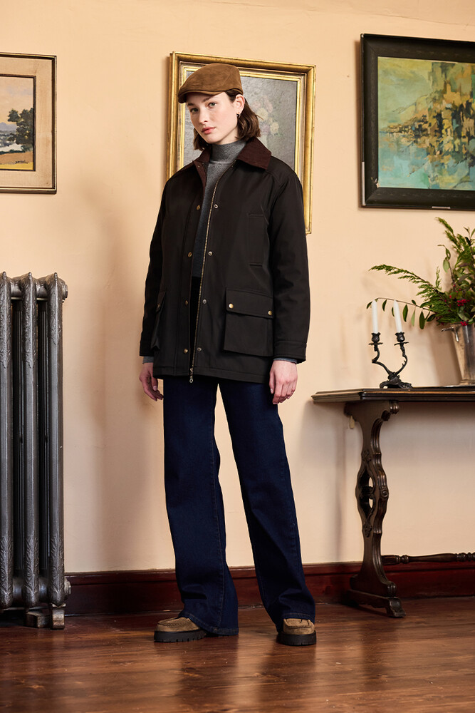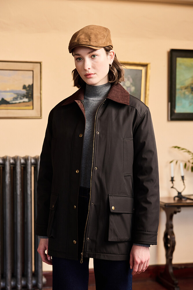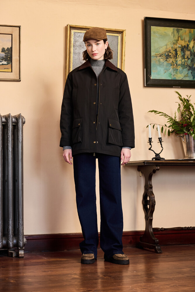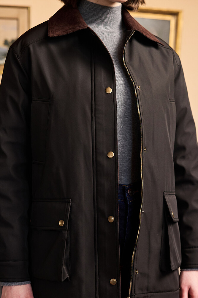 Astarı kapitoneli, kadife yakalı, çıtçıtlı mont.