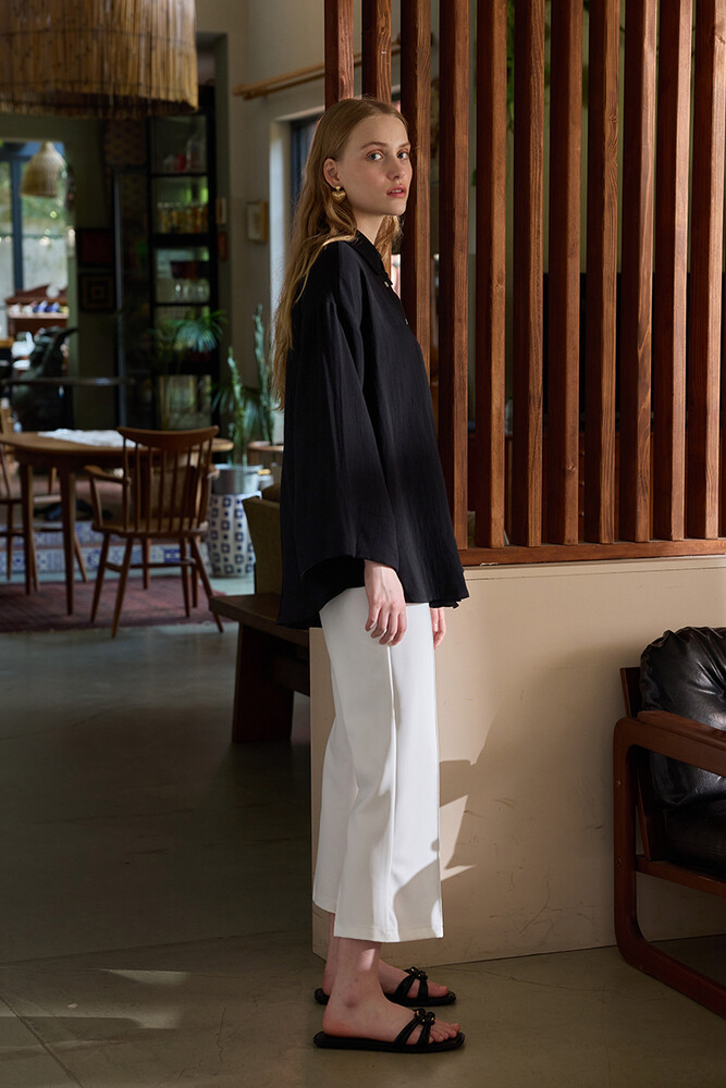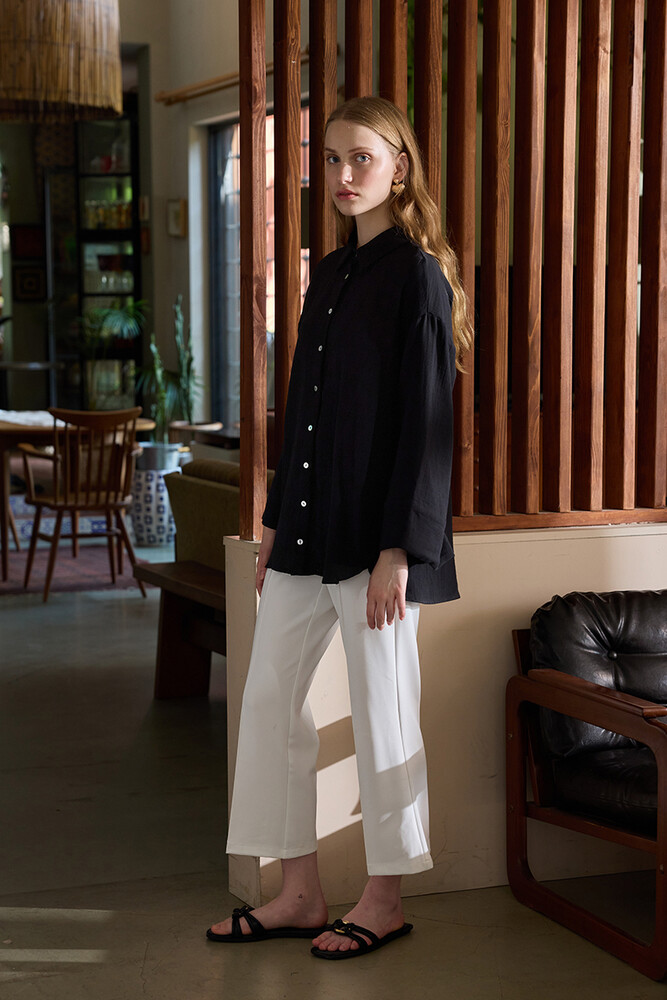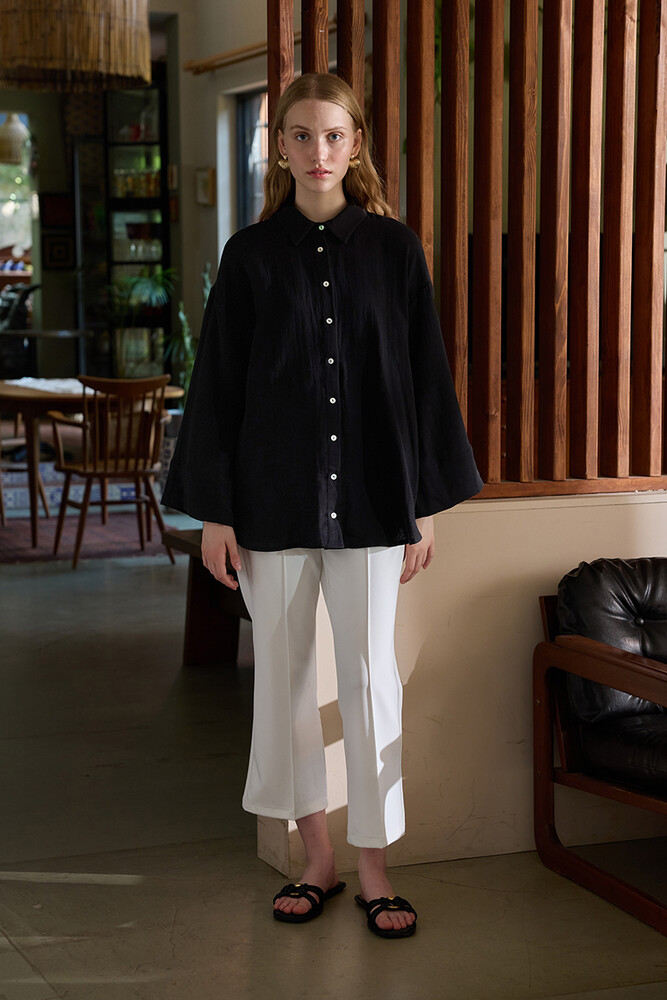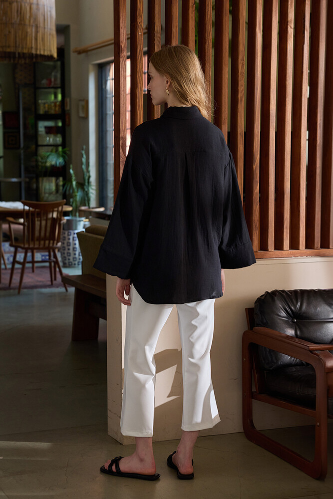 Muslin kumaştan, önü sedefli düğme detayı olan, kimono kollu gömlek.