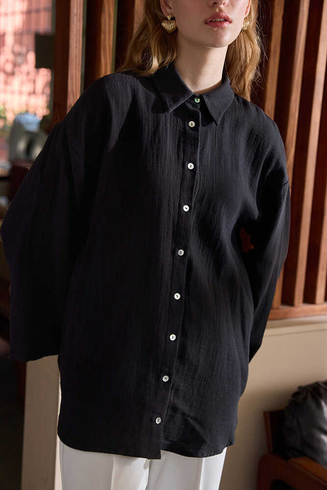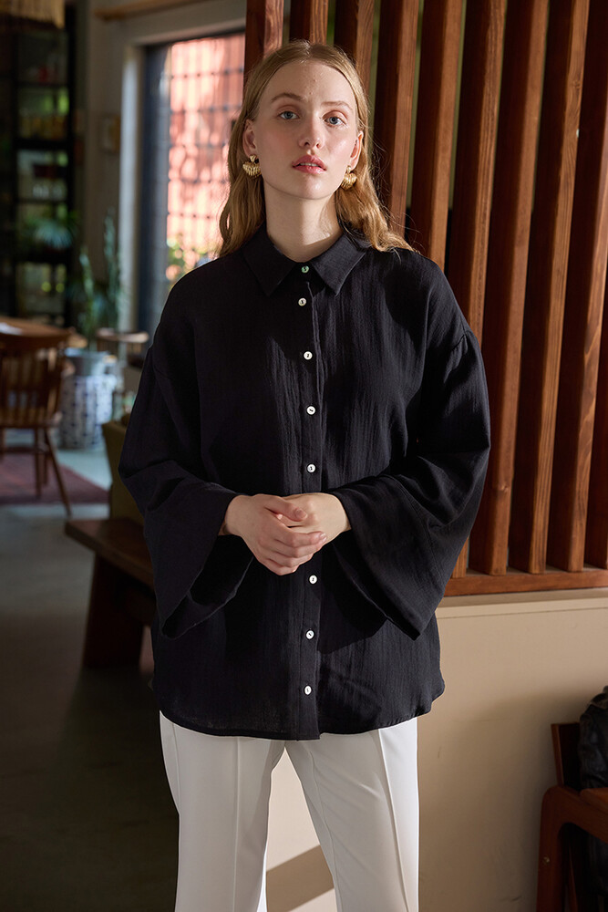 SİYAH KİMONO KOLLU MÜSLİN GÖMLEK