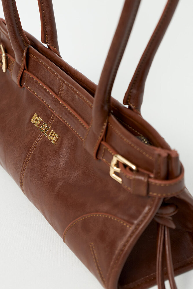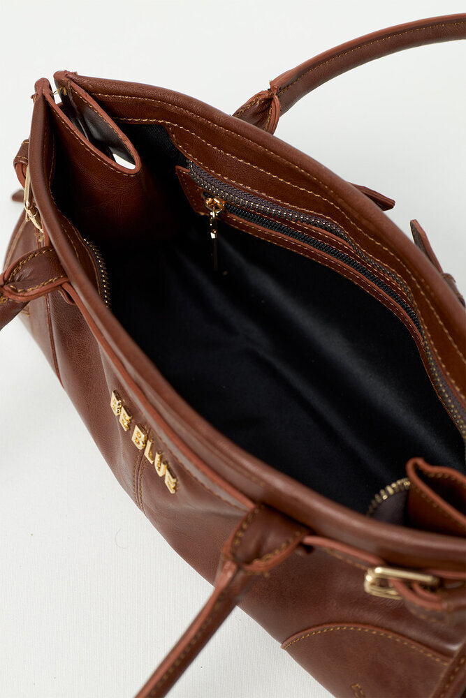 Çift saplı, fermuar kapamalı, gold logo ve kemer detaylı çanta.