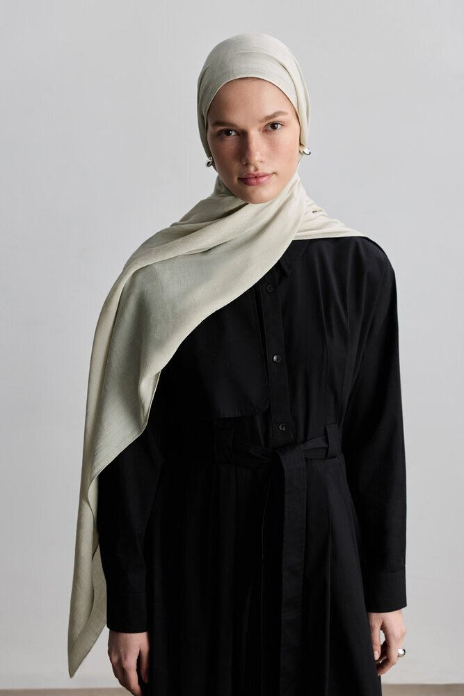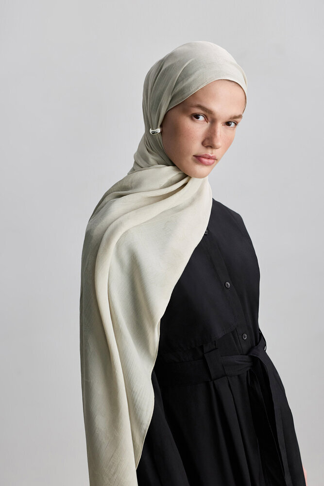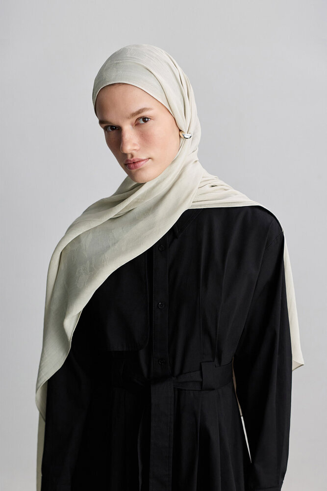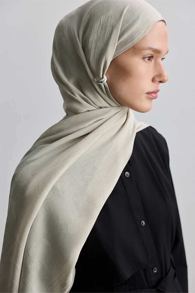 Jakarlı kumaştan kendinden desenli, yumuşak dokulu şal.